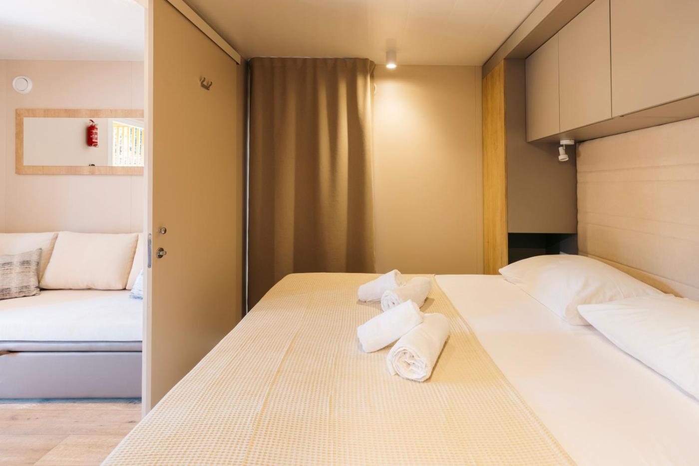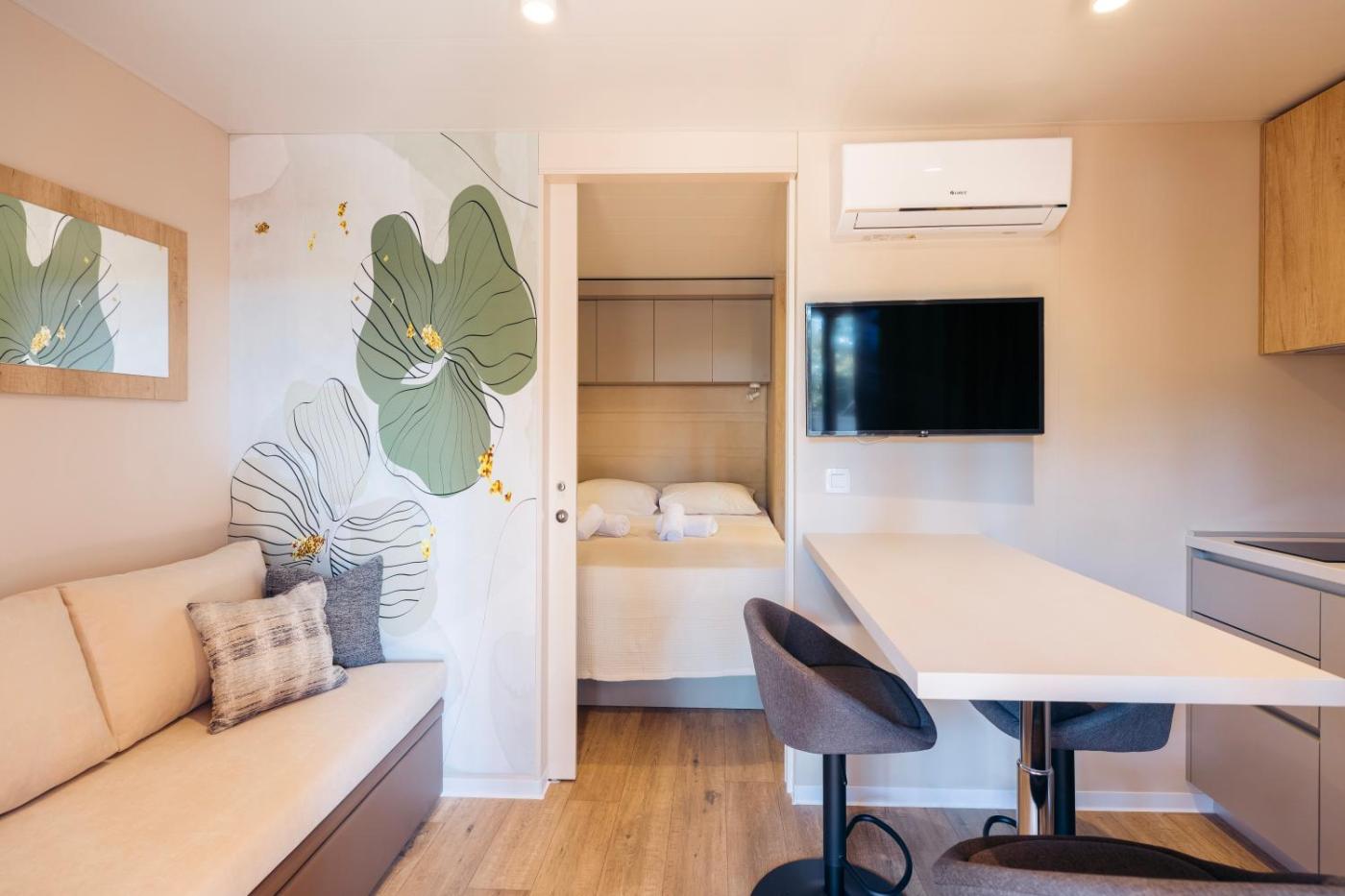 Deluxe Two-Bedroom Mobile Home with Terrace. Boasting a private entrance, this air-conditioned mobile home comes with 2 bedrooms and 2 bathrooms with a shower. Guests can make meals in the kitchen that features a stovetop, a refrigerator and kitchenware. A seating area with a flat-screen TV, a dining area and a terrace are available in this mobile home. The unit has 3 beds. ;