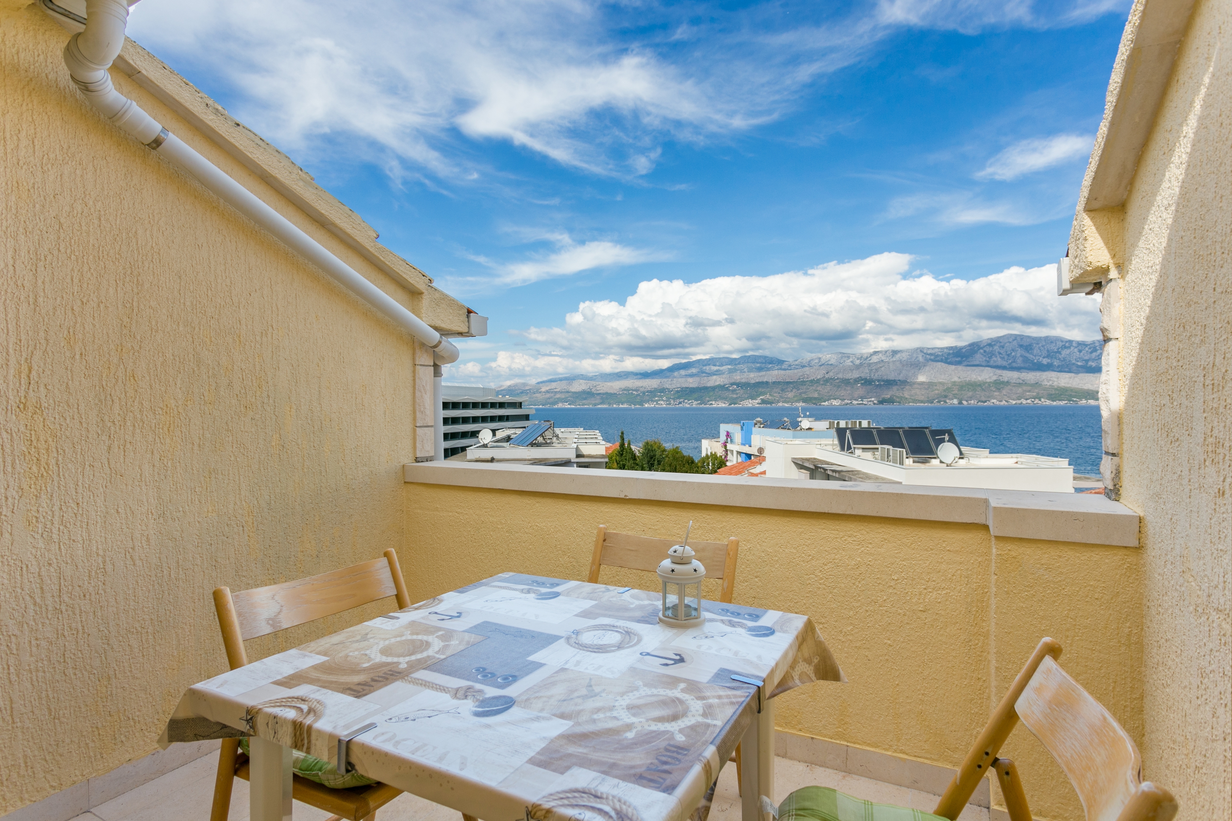 Apartament może przyjąć 3 gości. Łóżka znajdują się w sypialniach, których jest 2, na powierzchni 32m2. Goście mają dostęp do tarasu, by korzystać z ciepłych, letnich wieczorów. Z apartamentu roztacza się widok na morze. Możliwość przygotowywania posiłków poprzez korzystanie ze wspólnego grilla. WLICZONE W CENĘ: taksa pobytowa, sprzątanie końcowe, klimatyzacja, parking, internet, pranie bielizny, suszarka do włosów. Dostępność dodatkowych usług w rezerwowanym terminie oraz ich cenę (jeśli nie jest podana) należy sprawdzić wcześniej. Za dodatowe usługi, które nie zostały uwzględnione w kalkulacji ceny, płaci się bezpośrednio właścicielowi obiektu, pod warunkiem śe gość korzysta z tych usług.