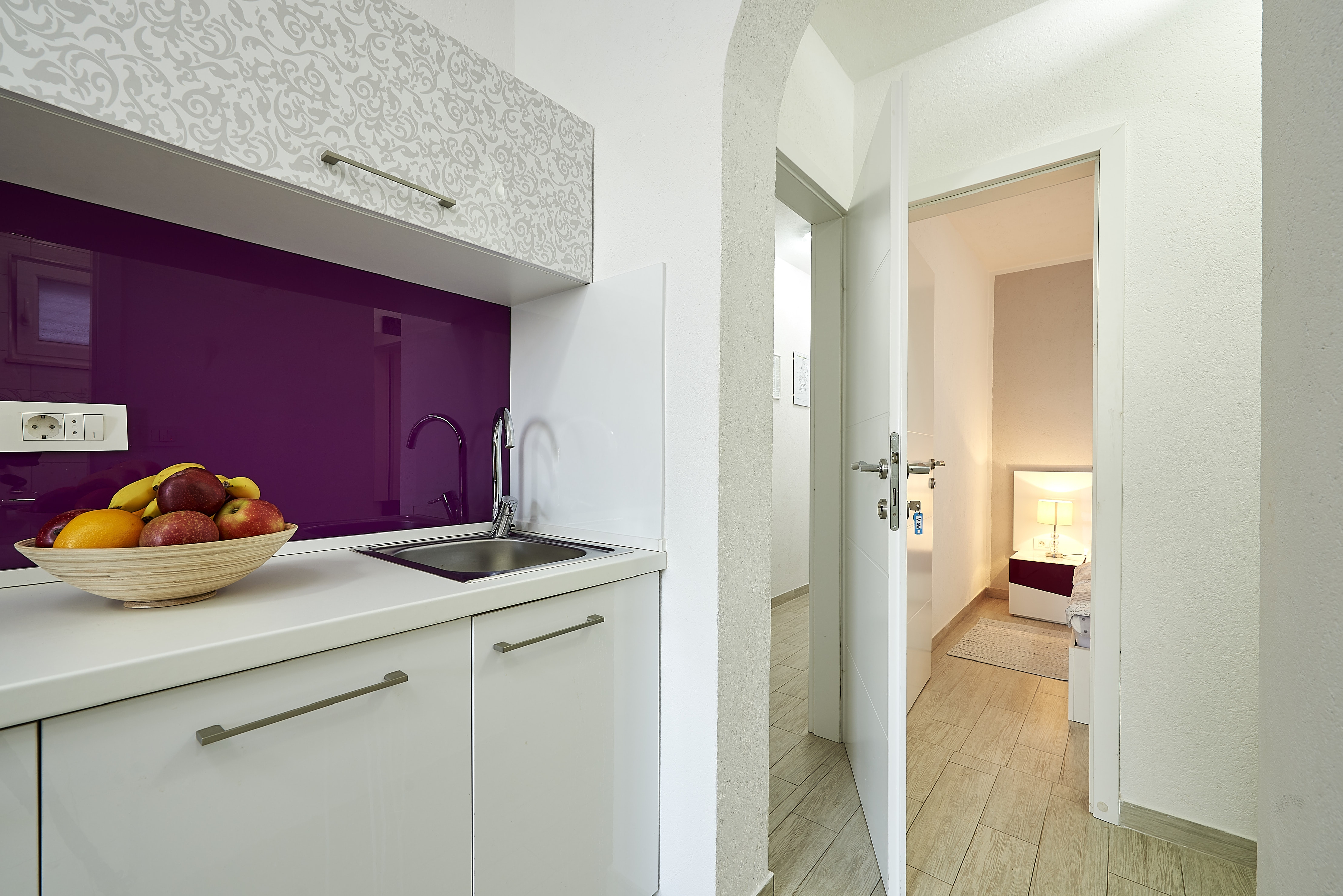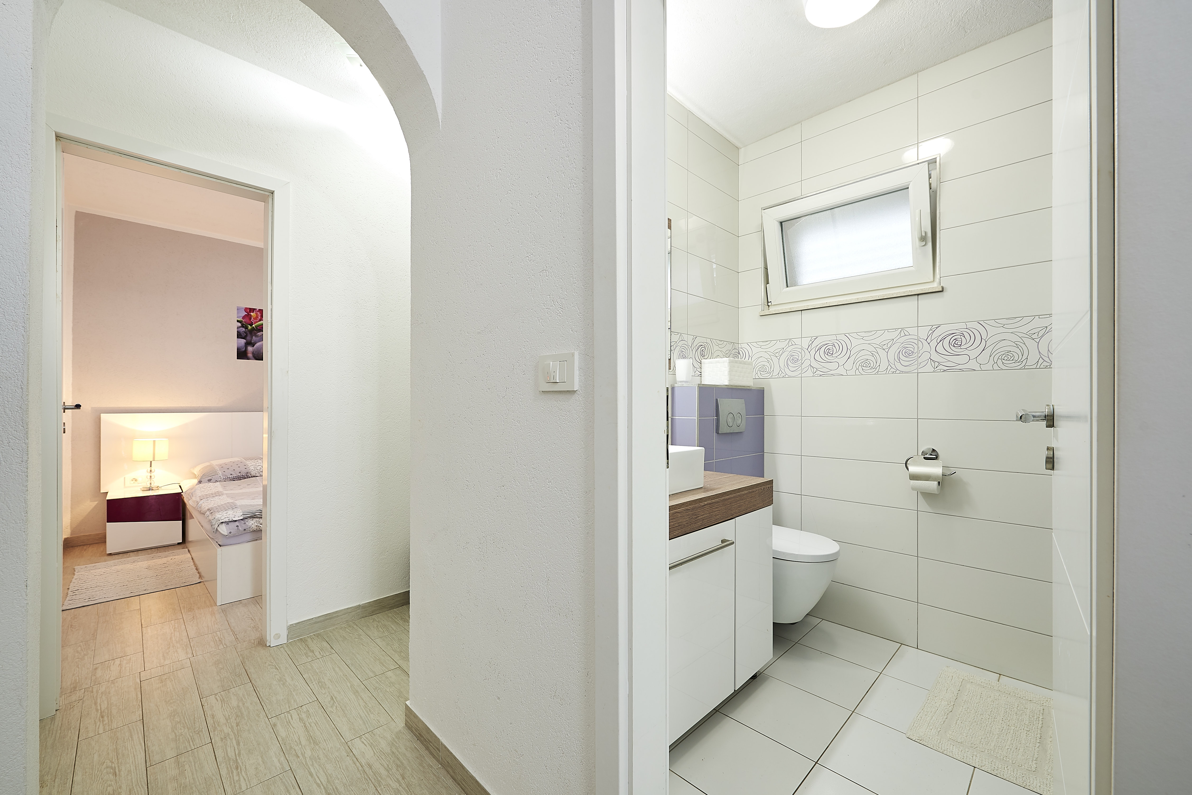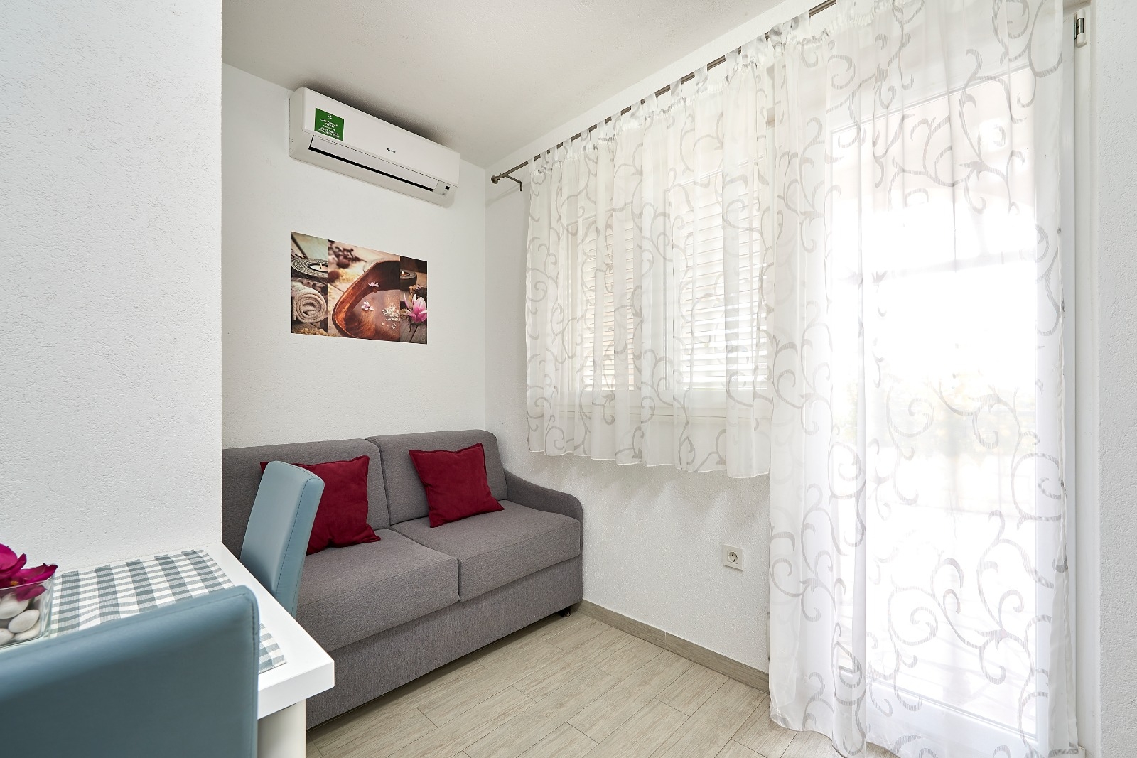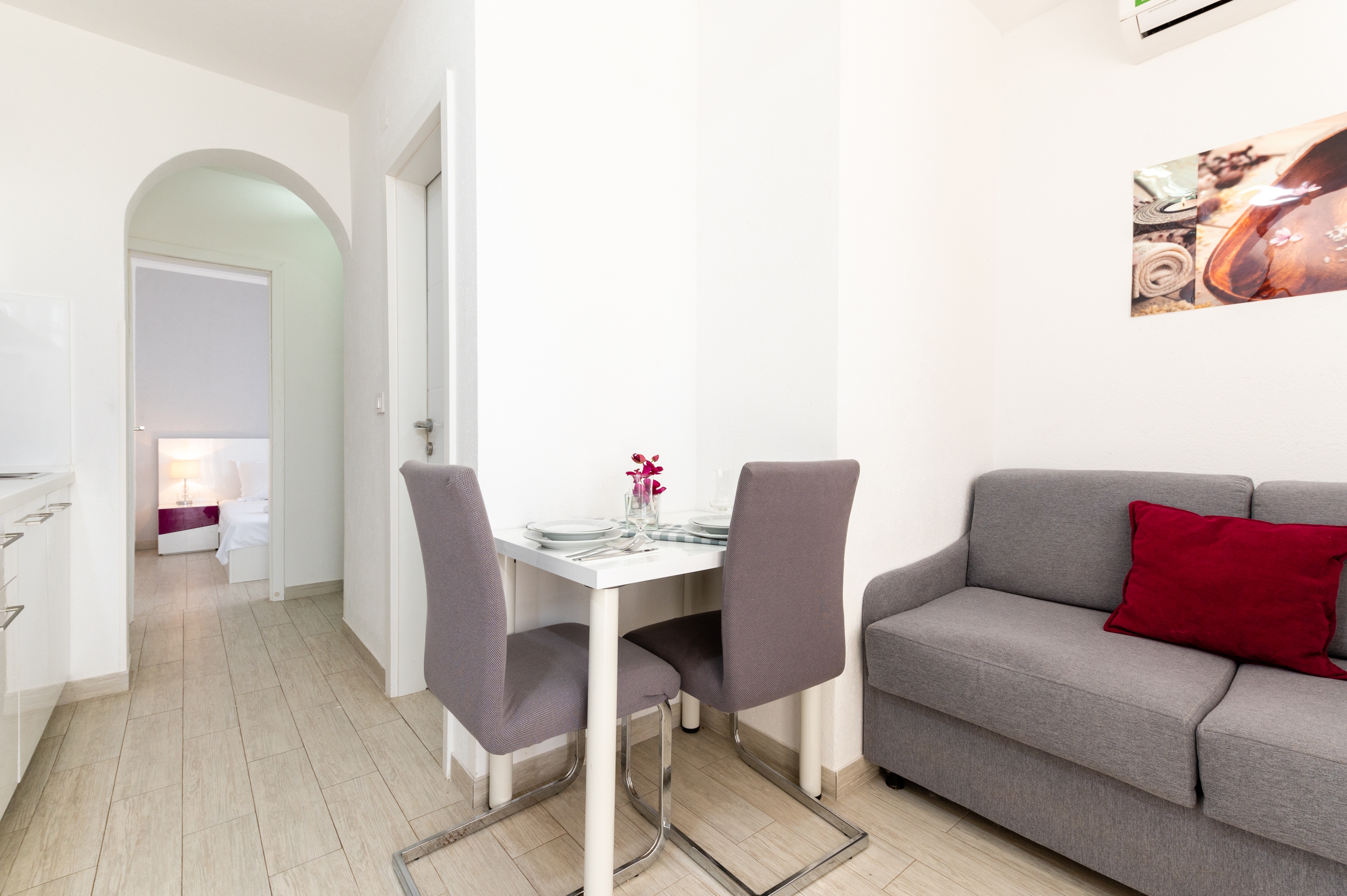 Apartament może przyjąć 2 gości. Łóżka znajdują się w sypialniach, których jest 1, na powierzchni 28m2. Goście mają dostęp do tarasu, by korzystać z ciepłych, letnich wieczorów. Z apartamentu roztacza się widok na morze. Możliwość przygotowywania posiłków poprzez korzystanie ze wspólnego grilla. W kwaterze dozwolony jest pobyt zwierzęcia domowego, za dopłatą. WLICZONE W CENĘ: taksa pobytowa, sprzątanie końcowe, klimatyzacja, parking, internet, łóżeczko dziecięce, suszarka do włosów, 1 łóżeczko dziecięce (zawarte w cenie). OBOWIĄZKOWE KOSZTY DODATKOWE: dopłata za krótki termin (procent dopłaty w zalezności od liczby noclegów: 30% - 1, 20% - 2, 10% - 3). NIEOBOWIĄZKOWE KOSZTY DODATKOWE: pranie bielizny (5,00 € pranie), zwierzęta domowe (5,00 € za nocleg). Dostępność dodatkowych usług w rezerwowanym terminie oraz ich cenę (jeśli nie jest podana) należy sprawdzić wcześniej. Za dodatowe usługi, które nie zostały uwzględnione w kalkulacji ceny, płaci się bezpośrednio właścicielowi obiektu, pod warunkiem śe gość korzysta z tych usług.