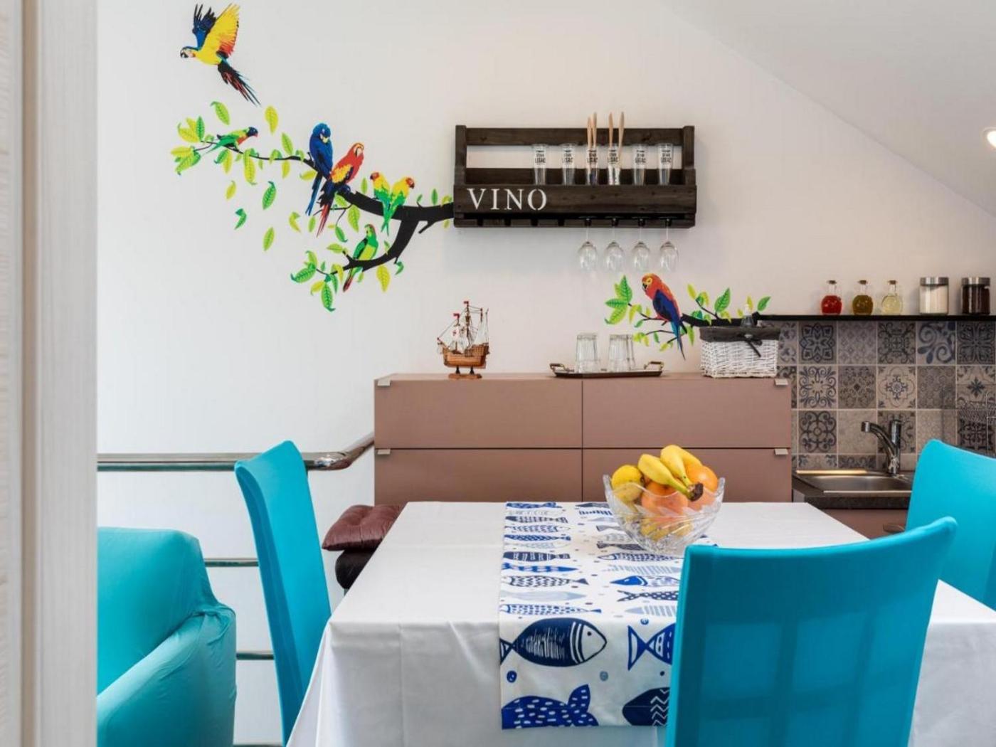 W apartamencie zapewniono kilka sypialni (2), łazienkę (1), jadalnię oraz kuchnię z pełnym wyposażeniem. Do dyspozycji Gości jest także telewizor z płaskim ekranem z dostępem do kanałów satelitarnych oraz balkon z widokiem na morze.