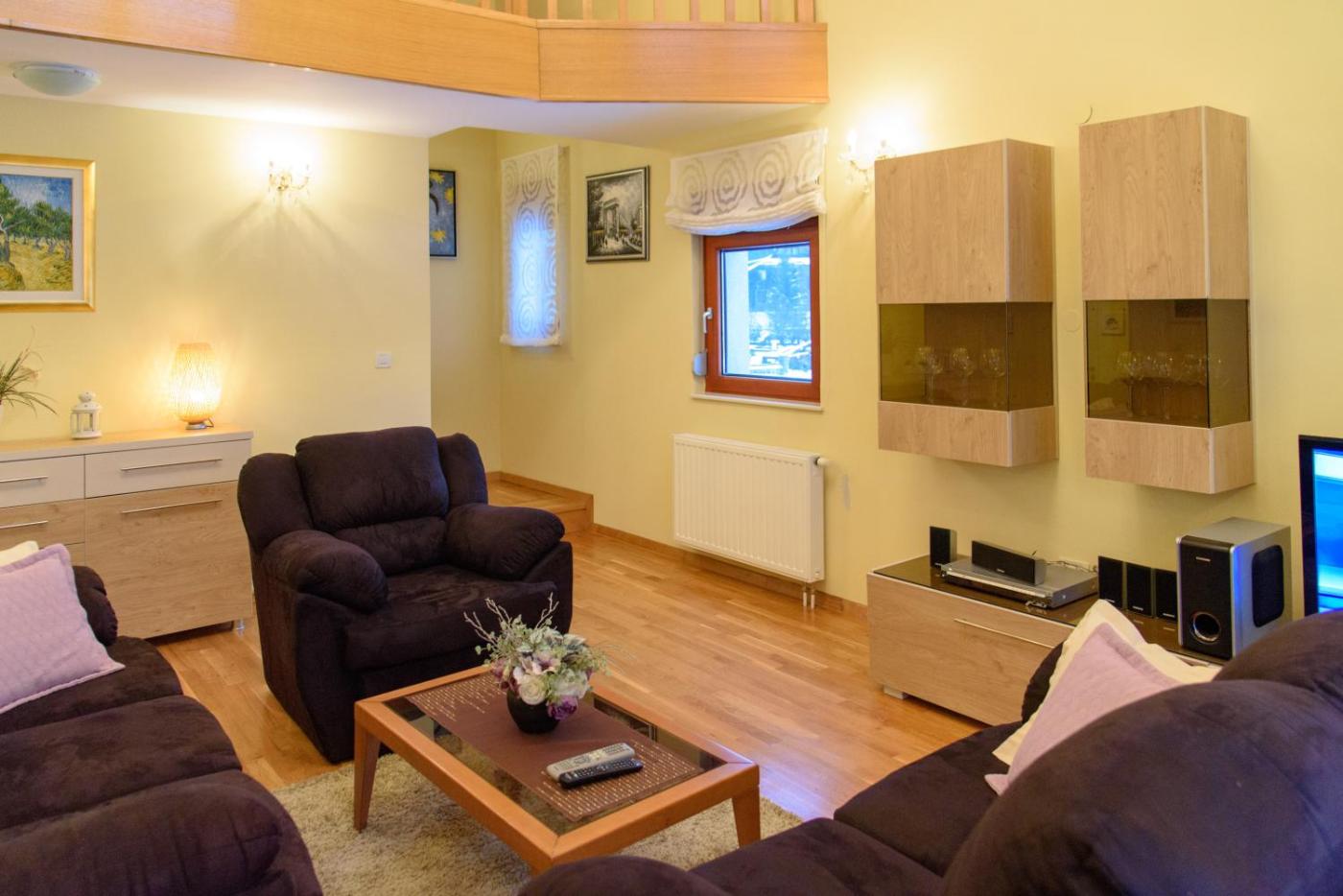 Willa. This villas standout feature is the fireplace. This spacious villa includes 1 living room, 7 separate bedrooms and 7 bathrooms with a bath and free toiletries. Guests will find a stovetop, a refrigerator, a dishwasher and an oven in the well-equipped kitchen. The villa also features a barbecue. The villa offers a washing machine, a private entrance, soundproof walls, a flat-screen TV with streaming services, as well as garden views. The unit has 10 beds. Willa - 11 osobowy. Powierzchnia pokoju ok.: 380 mkw.