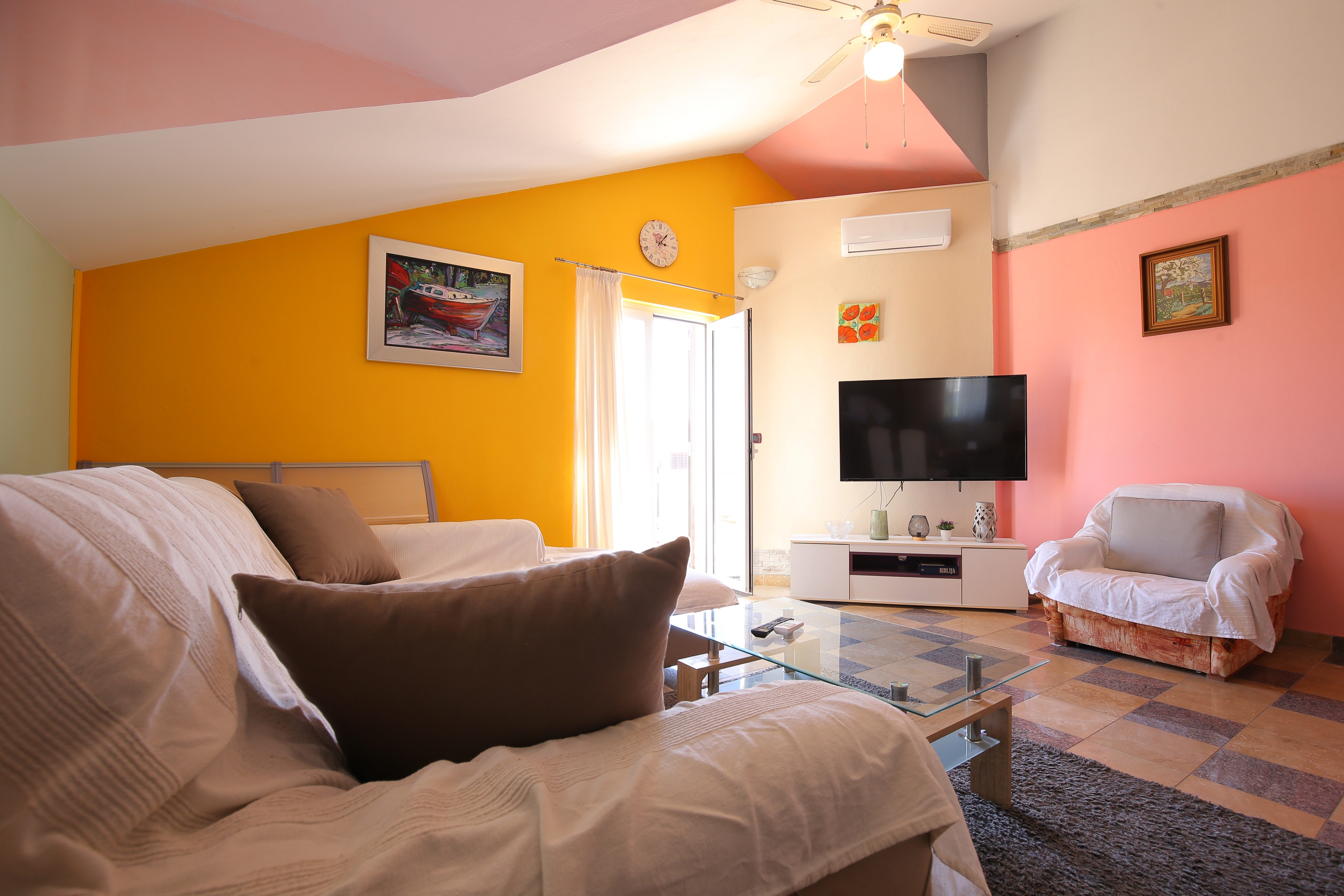 Apartament może przyjąć 5 gości. Łóżka znajdują się w sypialniach, których jest 3, na powierzchni 103m2. Goście mają dostęp do tarasu, by korzystać z ciepłych, letnich wieczorów. Z apartamentu roztacza się widok na morze. Możliwość przygotowywania posiłków poprzez korzystanie ze wspólnego grilla. Do kwatery można przyjechać ze zwierzęciem domowym, a usługa jest wliczona w cenę wynajęcia kwatery. WLICZONE W CENĘ: taksa pobytowa, sprzątanie końcowe, klimatyzacja, parking, internet, zwierzęta domowe, żelazko, deska do prasowania. Dostępność dodatkowych usług w rezerwowanym terminie oraz ich cenę (jeśli nie jest podana) należy sprawdzić wcześniej. Za dodatowe usługi, które nie zostały uwzględnione w kalkulacji ceny, płaci się bezpośrednio właścicielowi obiektu, pod warunkiem śe gość korzysta z tych usług.