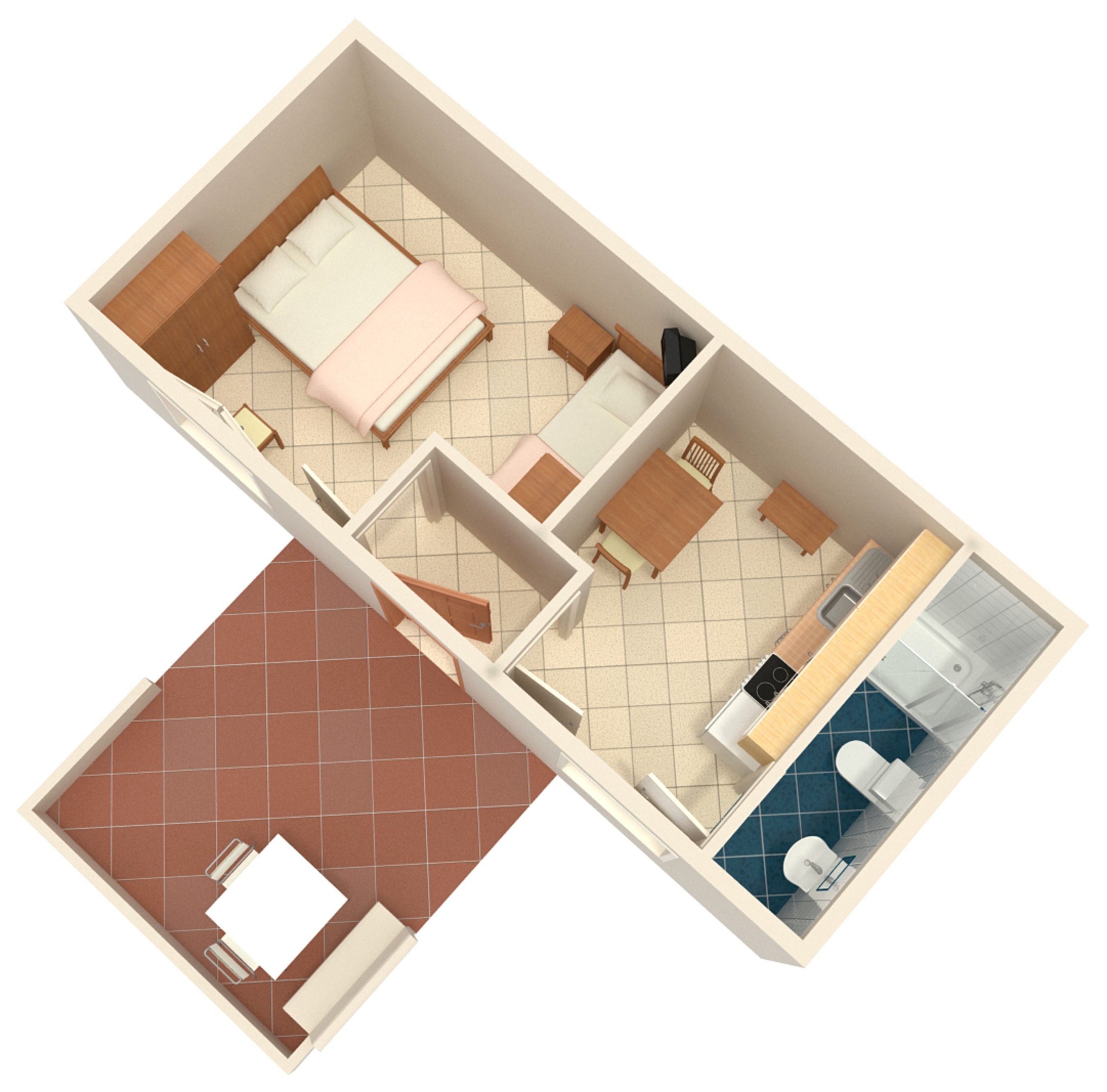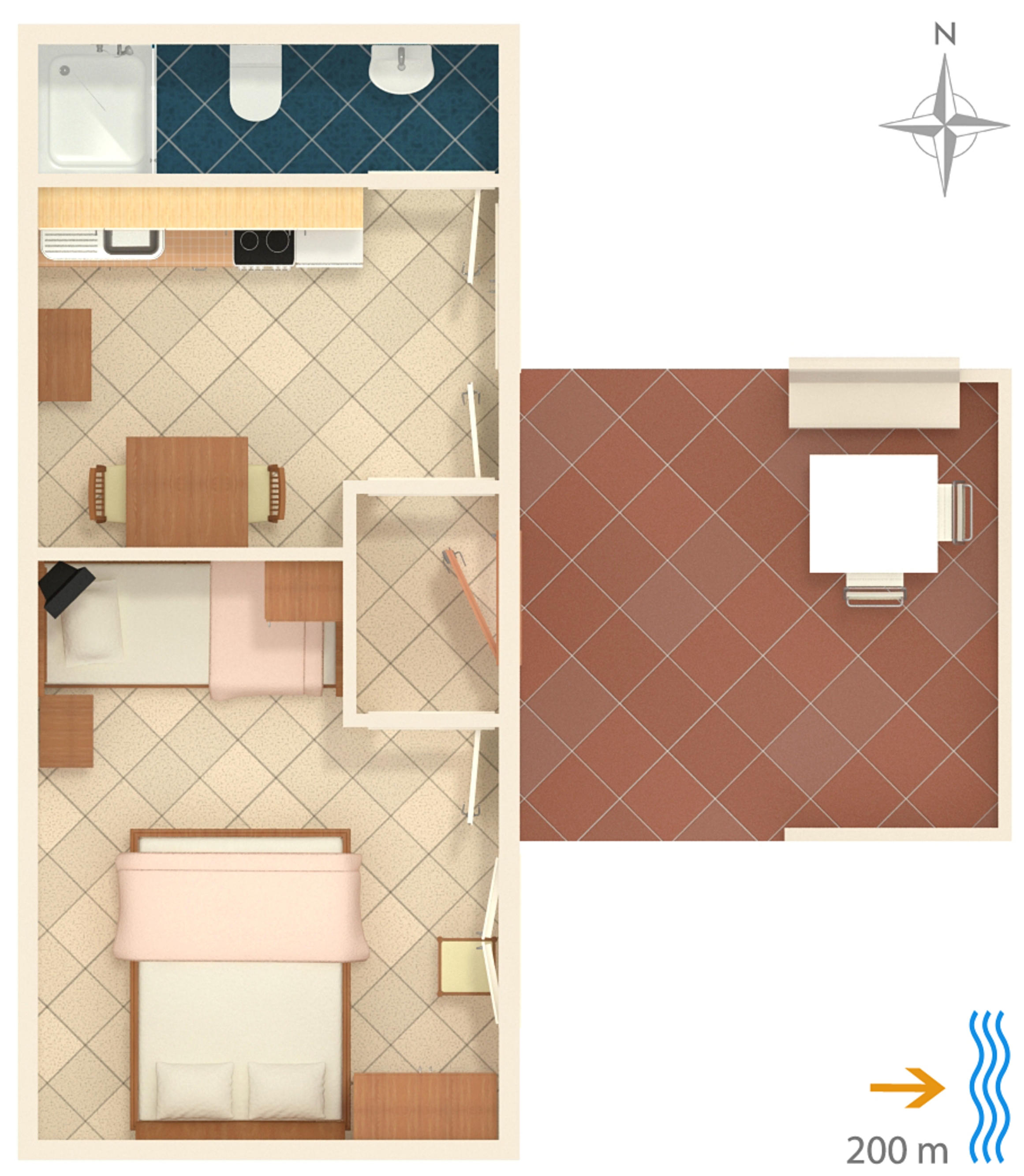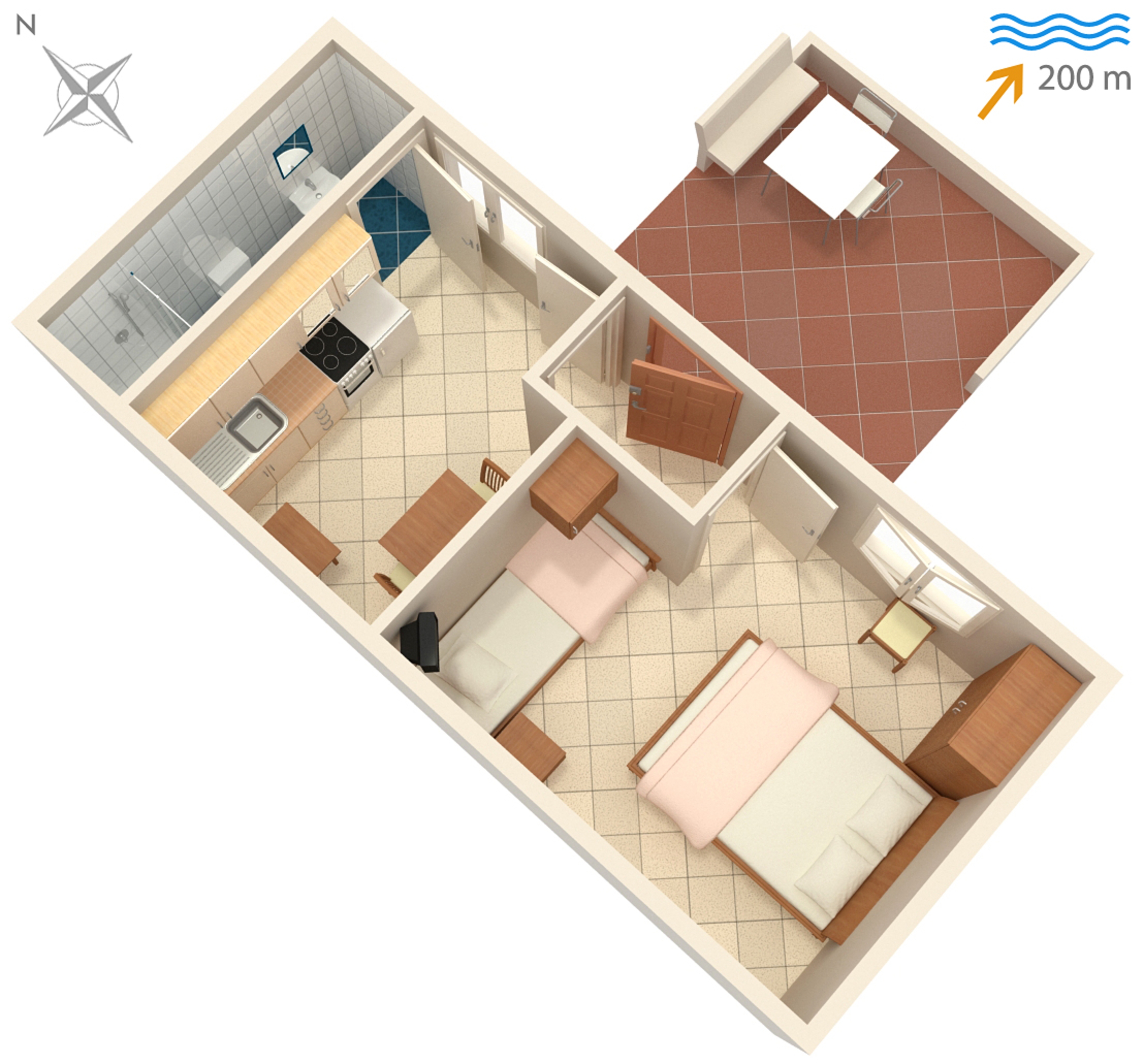 Apartament może przyjąć 2 gości. Łóżka znajdują się w sypialniach, których jest 1, na powierzchni 25m2. Goście mają dostęp do tarasu, by korzystać z ciepłych, letnich wieczorów. Możliwość przygotowywania posiłków poprzez korzystanie ze wspólnego grilla. W kwaterze dozwolony jest pobyt zwierzęcia domowego, za dopłatą. WLICZONE W CENĘ: taksa pobytowa, sprzątanie końcowe, parking, internet, żelazko, deska do prasowania, suszarka do włosów. OBOWIĄZKOWE KOSZTY DODATKOWE: dopłata za krótki termin (procent dopłaty w zalezności od liczby noclegów: 30% - 1, 20% - 2, 10% - 3). NIEOBOWIĄZKOWE KOSZTY DODATKOWE: zwierzęta domowe (7,00 € za nocleg), 1 łóżeczko dziecięce (5,00 € osobadzień). Dostępność dodatkowych usług w rezerwowanym terminie oraz ich cenę (jeśli nie jest podana) należy sprawdzić wcześniej. Za dodatowe usługi, które nie zostały uwzględnione w kalkulacji ceny, płaci się bezpośrednio właścicielowi obiektu, pod warunkiem śe gość korzysta z tych usług. Zniżki od ceny podstawowej: bezpłatny dzień 14=13 (przy pobycie, trwającym co najmniej 14 dni, otrzymujecie jeden bezpłatny dzień na pobyt do 31.12.2026).