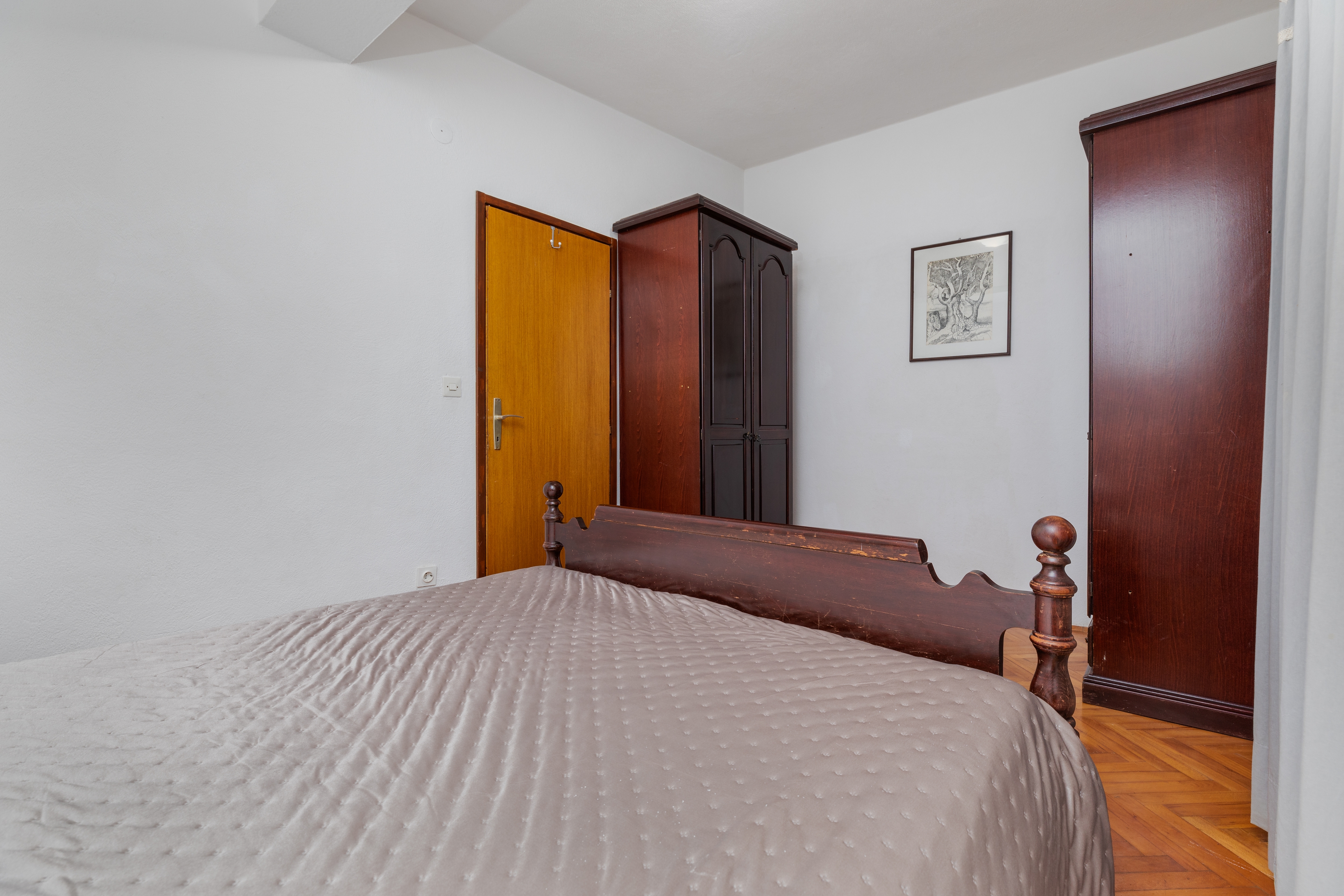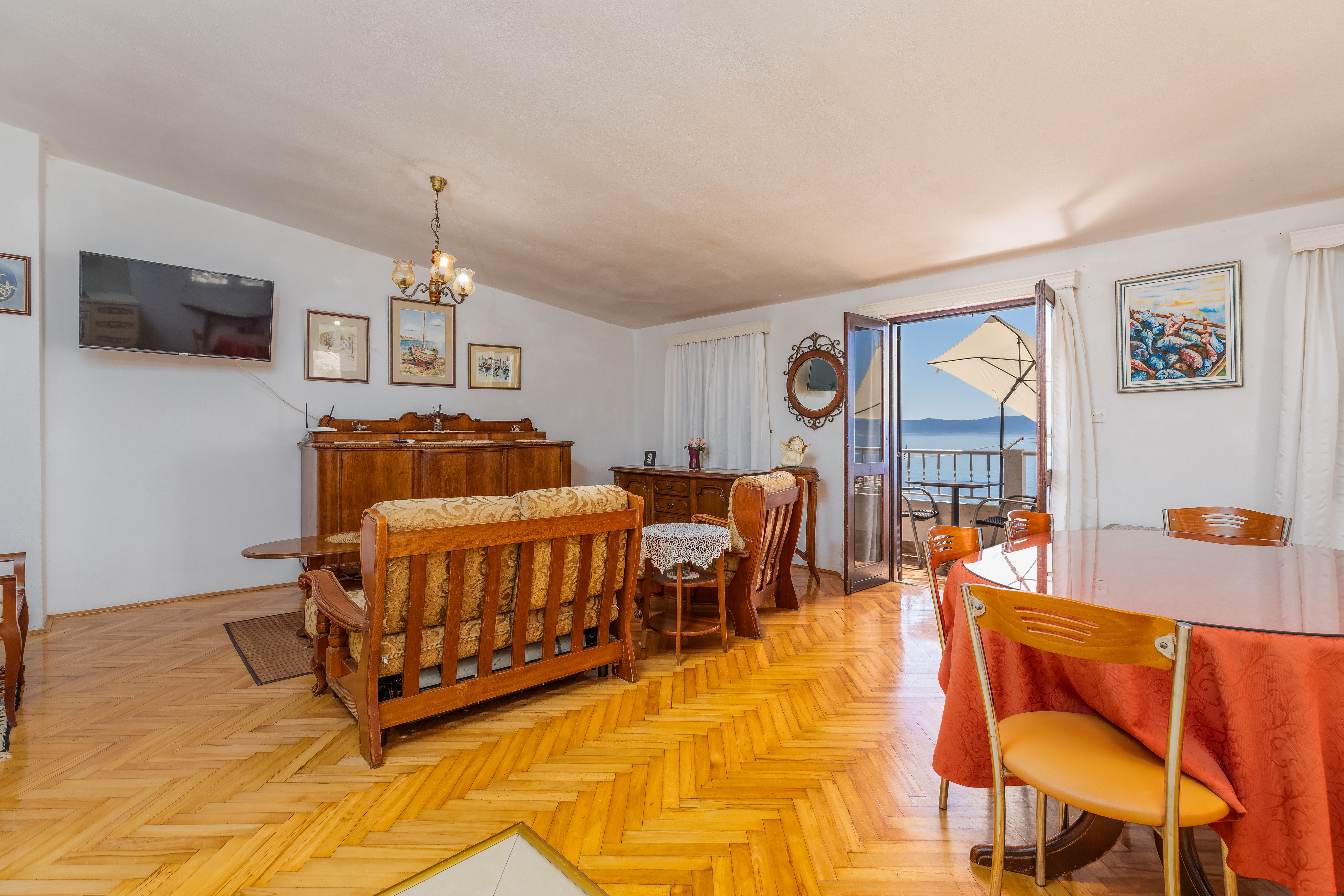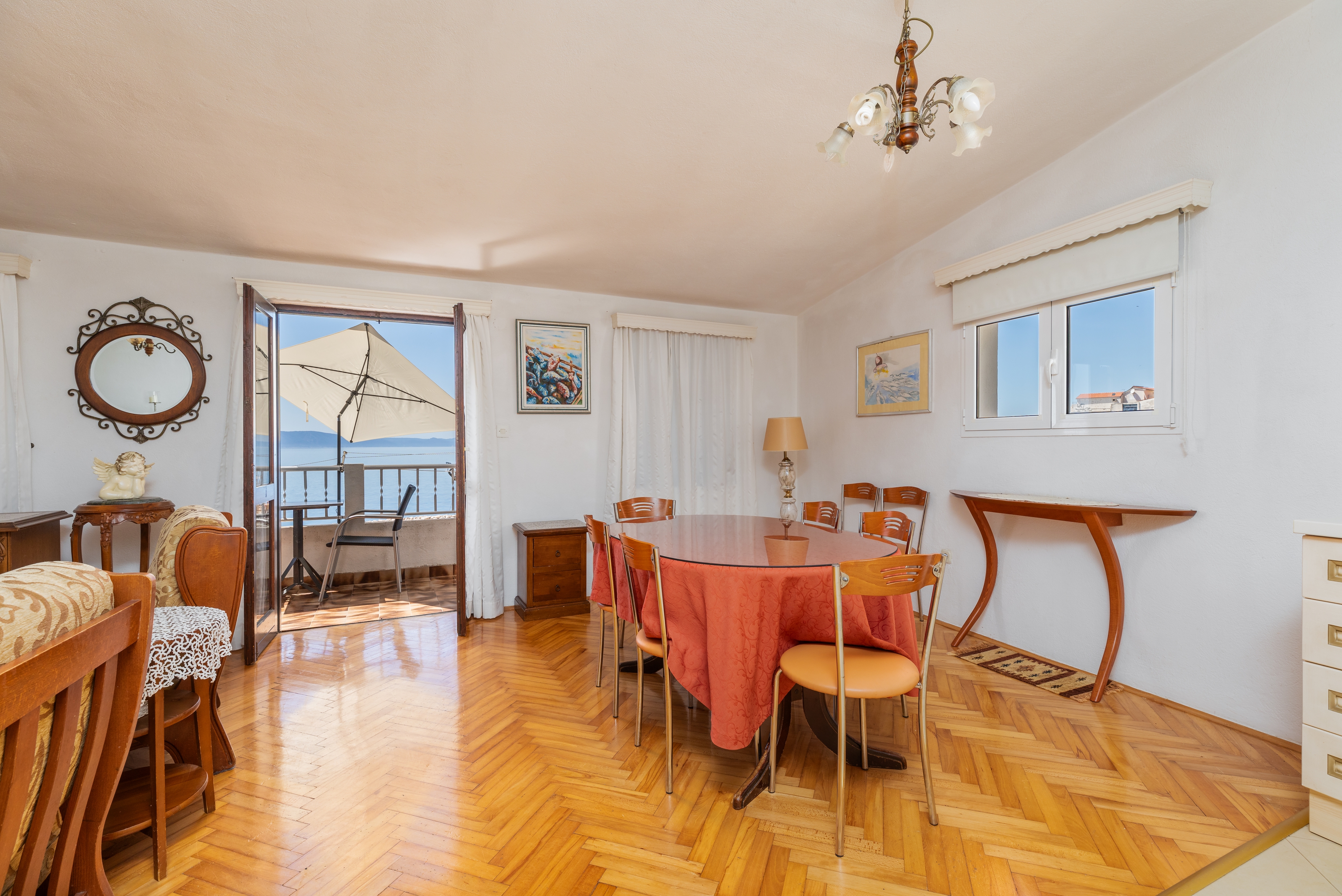 Apartament może przyjąć 7 gości. Łóżka znajdują się w sypialniach, których jest 3, na powierzchni 98m2. Goście mają dostęp do balkonu, by korzystać z ciepłych, letnich wieczorów. Z apartamentu roztacza się widok na morze. W kwaterze dozwolony jest pobyt zwierzęcia domowego, za dopłatą. WLICZONE W CENĘ: taksa pobytowa, sprzątanie końcowe, klimatyzacja, parking, internet, łóżeczko dziecięce, żelazko, deska do prasowania, suszarka do włosów. OBOWIĄZKOWE KOSZTY DODATKOWE: dopłata za krótki termin (procent dopłaty w zalezności od liczby noclegów: 30% - 1, 20% - 2, 10% - 3). NIEOBOWIĄZKOWE KOSZTY DODATKOWE: zwierzęta domowe (8,00 € za nocleg). Dostępność dodatkowych usług w rezerwowanym terminie oraz ich cenę (jeśli nie jest podana) należy sprawdzić wcześniej. Za dodatowe usługi, które nie zostały uwzględnione w kalkulacji ceny, płaci się bezpośrednio właścicielowi obiektu, pod warunkiem śe gość korzysta z tych usług.
