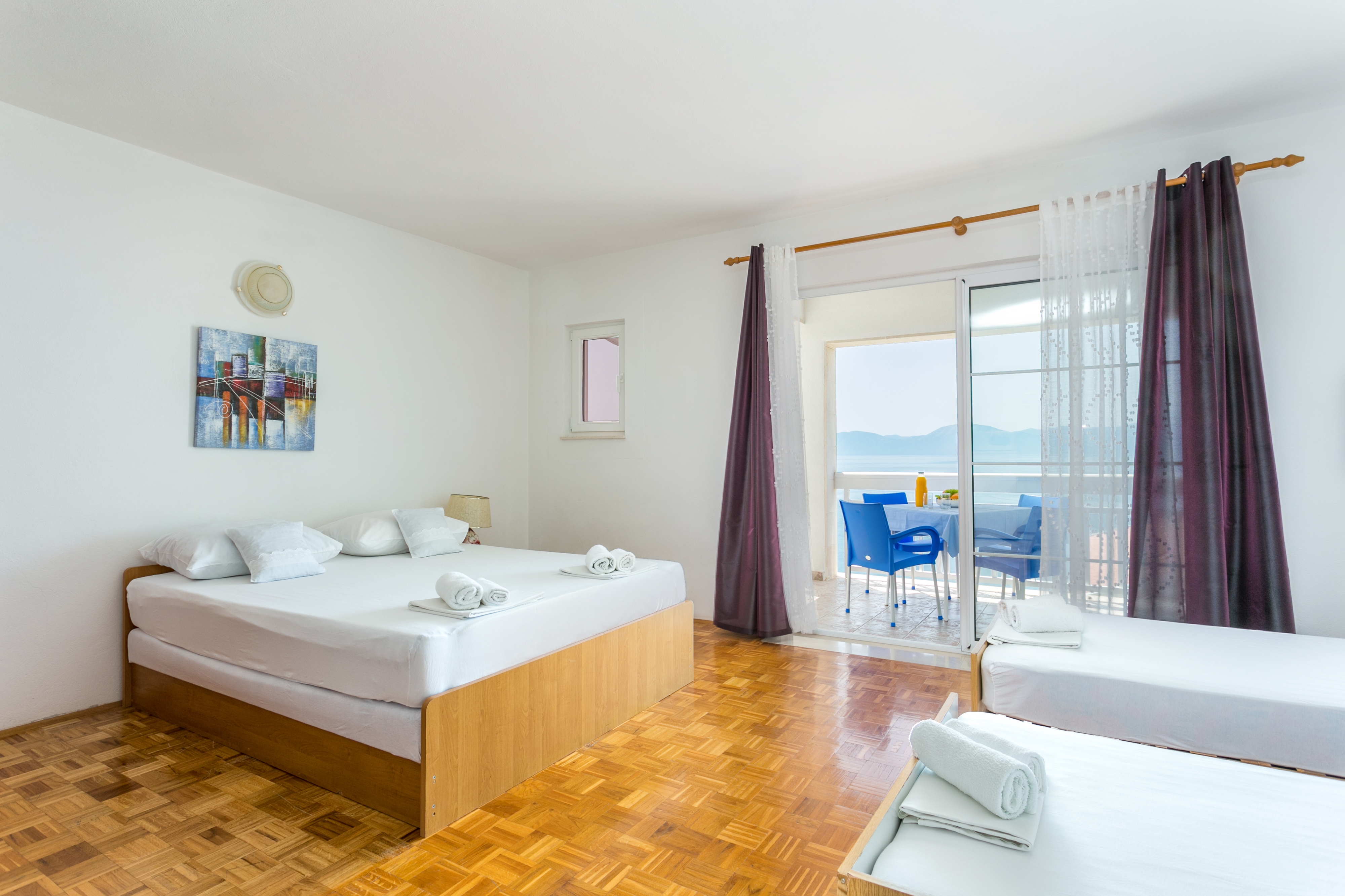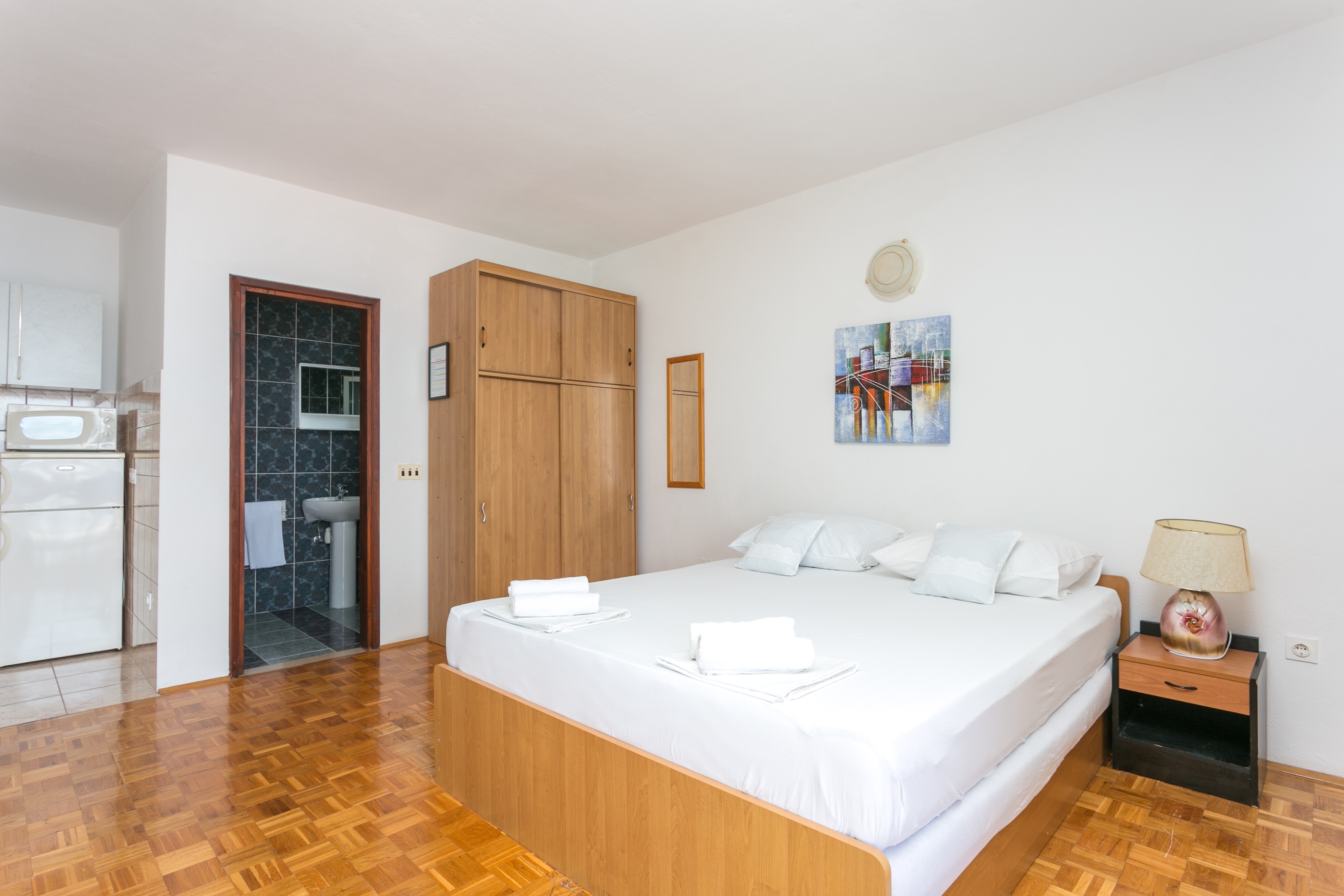 Studio może przyjąć 4 gości. Łóżka znajdują się w sypialniach, których jest 1, na powierzchni 33m2. Goście mają dostęp do tarasu, by korzystać z ciepłych, letnich wieczorów. Z apartamentu typu studio roztacza się widok na morze. WLICZONE W CENĘ: taksa pobytowa, sprzątanie końcowe, parking, internet, łóżeczko dziecięce, żelazko, deska do prasowania, suszarka do włosów, parasol, leżaki. OBOWIĄZKOWE KOSZTY DODATKOWE: dopłata za krótki termin (procent dopłaty w zalezności od liczby noclegów: 30% - 1, 20% - 2, 10% - 3). NIEOBOWIĄZKOWE KOSZTY DODATKOWE: klimatyzacja (8,00 € za nocleg). Dostępność dodatkowych usług w rezerwowanym terminie oraz ich cenę (jeśli nie jest podana) należy sprawdzić wcześniej. Za dodatowe usługi, które nie zostały uwzględnione w kalkulacji ceny, płaci się bezpośrednio właścicielowi obiektu, pod warunkiem śe gość korzysta z tych usług. Zniżki od ceny podstawowej: bezpłatny dzień 14=13 (przy pobycie, trwającym co najmniej 14 dni, otrzymujecie jeden bezpłatny dzień na pobyt do 31.12.2026).