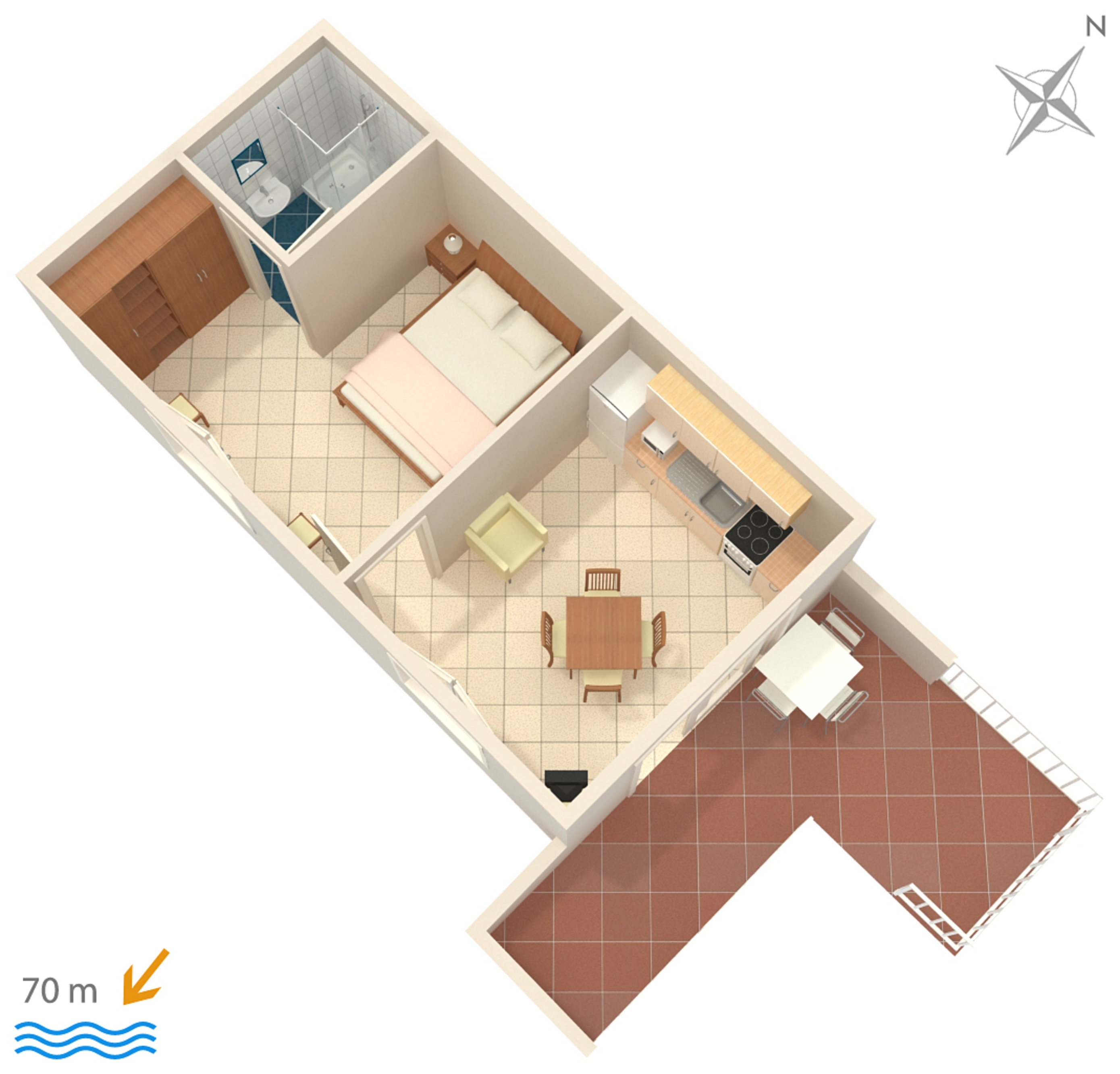Apartament może przyjąć 2 gości. Łóżka znajdują się w sypialniach, których jest 1, na powierzchni 26m2. Goście mają dostęp do tarasu, by korzystać z ciepłych, letnich wieczorów. Z apartamentu roztacza się widok na morze. Możliwość przygotowywania posiłków poprzez korzystanie ze wspólnego grilla. WLICZONE W CENĘ: taksa pobytowa, sprzątanie końcowe, internet, pranie bielizny, żelazko, deska do prasowania. OBOWIĄZKOWE KOSZTY DODATKOWE: dopłata za krótki termin (procent dopłaty w zalezności od liczby noclegów: 30% - 1, 20% - 2, 10% - 3). NIEOBOWIĄZKOWE KOSZTY DODATKOWE: klimatyzacja (7,00 € za nocleg). Dostępność dodatkowych usług w rezerwowanym terminie oraz ich cenę (jeśli nie jest podana) należy sprawdzić wcześniej. Za dodatowe usługi, które nie zostały uwzględnione w kalkulacji ceny, płaci się bezpośrednio właścicielowi obiektu, pod warunkiem śe gość korzysta z tych usług. Zniżki od ceny podstawowej: bezpłatny dzień 14=13 (przy pobycie, trwającym co najmniej 14 dni, otrzymujecie jeden bezpłatny dzień na pobyt do 31.12.2026).