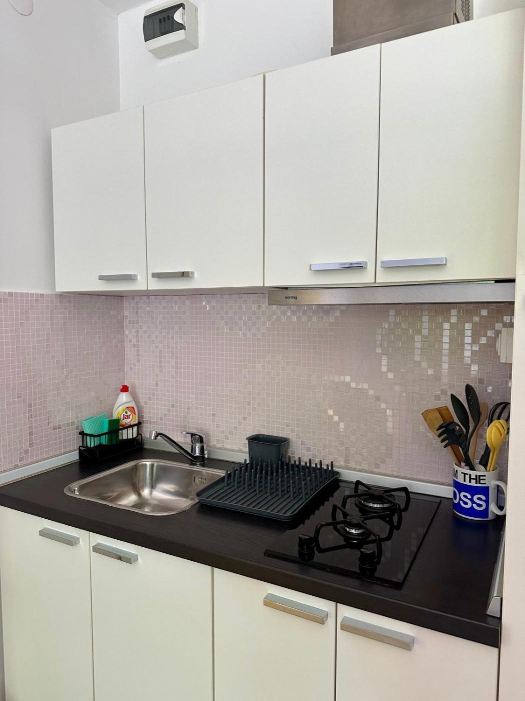 W apartamencie do dyspozycji gości przygotowano sypialnię (1), kuchnię ze standardowym wyposażeniem, takim jak lodówka i płyta kuchenna, a także łazienkę (1) z prysznicem. Wyposażenie obejmuje także telewizor z płaskim ekranem z dostępem do kanałów kablowych.