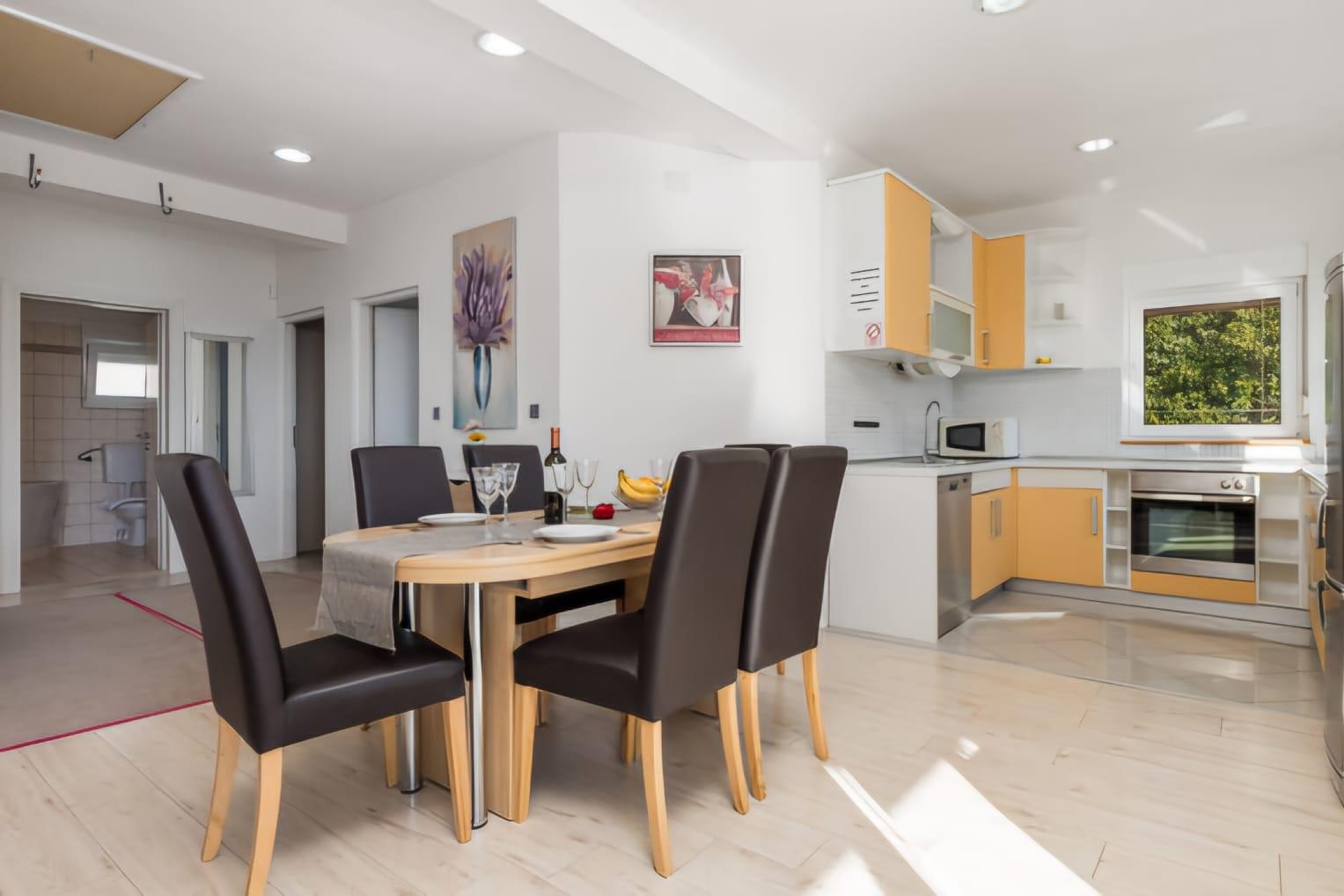 Dom może przyjąć 12 gości. Łóżka znajdują się w sypialniach, których jest 6, oraz w pokoju dziennym, na powierzchni 174m2. Goście mają dostęp do balkonu, by korzystać z ciepłych, letnich wieczorów. Z domu wakacyjnego roztacza się widok na morze. Grill jest dostępny tylko do użytku gości z tej kwatery. W trakcie swojego pobytu goście mogą zrelakswować się w prywatnym basenie. WLICZONE W CENĘ: taksa pobytowa, sprzątanie końcowe, klimatyzacja, basen, parking, internet, łóżeczko dziecięce, żelazko, deska do prasowania, suszarka do włosów, parasol, leżaki. OBOWIĄZKOWE KOSZTY DODATKOWE: dopłata za krótki termin (procent dopłaty w zalezności od liczby noclegów: 30% - 1, 20% - 2, 10% - 3). Dostępność dodatkowych usług w rezerwowanym terminie oraz ich cenę (jeśli nie jest podana) należy sprawdzić wcześniej. Za dodatowe usługi, które nie zostały uwzględnione w kalkulacji ceny, płaci się bezpośrednio właścicielowi obiektu, pod warunkiem śe gość korzysta z tych usług. Zniżki od ceny podstawowej: bezpłatny dzień 14=13 (przy pobycie, trwającym co najmniej 14 dni, otrzymujecie jeden bezpłatny dzień na pobyt do 31.12.2026).