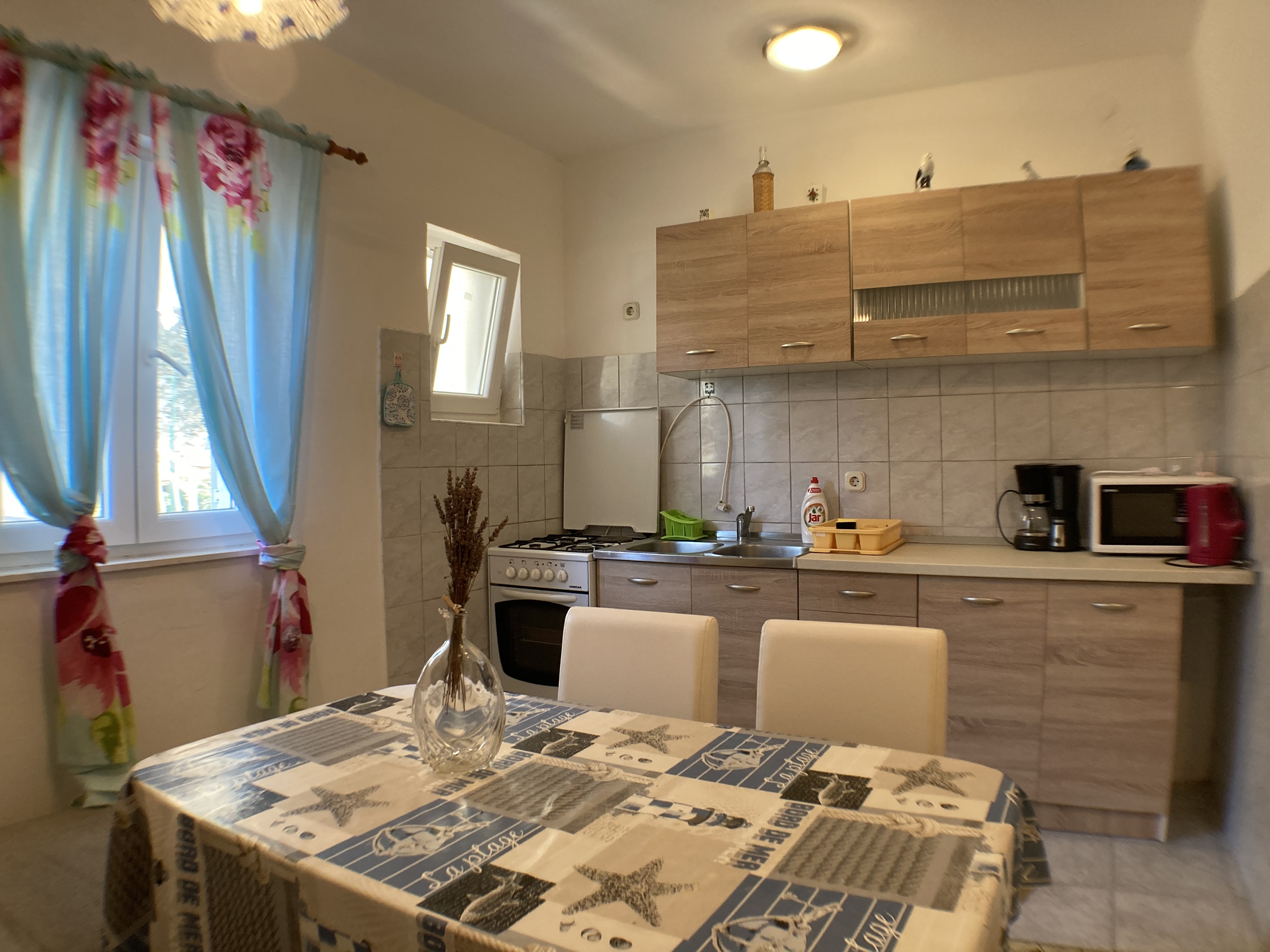 Apartament może przyjąć 6 gości. Łóżka znajdują się w sypialniach, których jest 2, na powierzchni 48m2. Goście mają dostęp do balkonu, by korzystać z ciepłych, letnich wieczorów. Z apartamentu roztacza się widok na morze. Możliwość przygotowywania posiłków poprzez korzystanie ze wspólnego grilla. W kwaterze dozwolony jest pobyt zwierzęcia domowego, za dopłatą. Rezerwowana kwatera ma taras wspólny z inną kwaterą. WLICZONE W CENĘ: taksa pobytowa, sprzątanie końcowe, klimatyzacja, parking, internet, żelazko, deska do prasowania, suszarka do włosów. OBOWIĄZKOWE KOSZTY DODATKOWE: dopłata za krótki termin (procent dopłaty w zalezności od liczby noclegów: 30% - 1, 20% - 2, 10% - 3). NIEOBOWIĄZKOWE KOSZTY DODATKOWE: zwierzęta domowe (5,00 € za nocleg). Dostępność dodatkowych usług w rezerwowanym terminie oraz ich cenę (jeśli nie jest podana) należy sprawdzić wcześniej. Za dodatowe usługi, które nie zostały uwzględnione w kalkulacji ceny, płaci się bezpośrednio właścicielowi obiektu, pod warunkiem śe gość korzysta z tych usług.