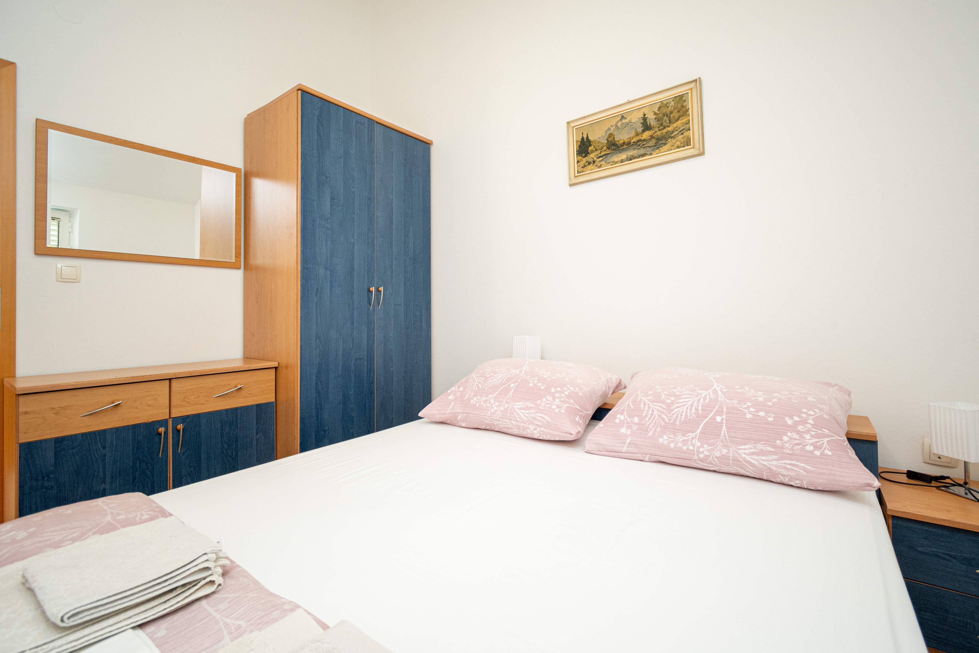 Apartament może przyjąć 4 gości. Łóżka znajdują się w sypialniach, których jest 2, na powierzchni 38m2. Goście mają dostęp do tarasu, by korzystać z ciepłych, letnich wieczorów. Z apartamentu roztacza się widok na morze. Możliwość przygotowywania posiłków poprzez korzystanie ze wspólnego grilla. W kwaterze dozwolony jest pobyt zwierzęcia domowego, za dopłatą. WLICZONE W CENĘ: taksa pobytowa, sprzątanie końcowe, klimatyzacja, parking, internet, pranie bielizny, miejsce do cumowania łodzi, łóżeczko dziecięce, suszarka do włosów, parasol, leżaki. NIEOBOWIĄZKOWE KOSZTY DODATKOWE: zwierzęta domowe (15,00 € za nocleg). Dostępność dodatkowych usług w rezerwowanym terminie oraz ich cenę (jeśli nie jest podana) należy sprawdzić wcześniej. Za dodatowe usługi, które nie zostały uwzględnione w kalkulacji ceny, płaci się bezpośrednio właścicielowi obiektu, pod warunkiem śe gość korzysta z tych usług. Zniżki od ceny podstawowej: bezpłatny dzień 14=13 (przy pobycie, trwającym co najmniej 14 dni, otrzymujecie jeden bezpłatny dzień na pobyt do 31.12.2026).