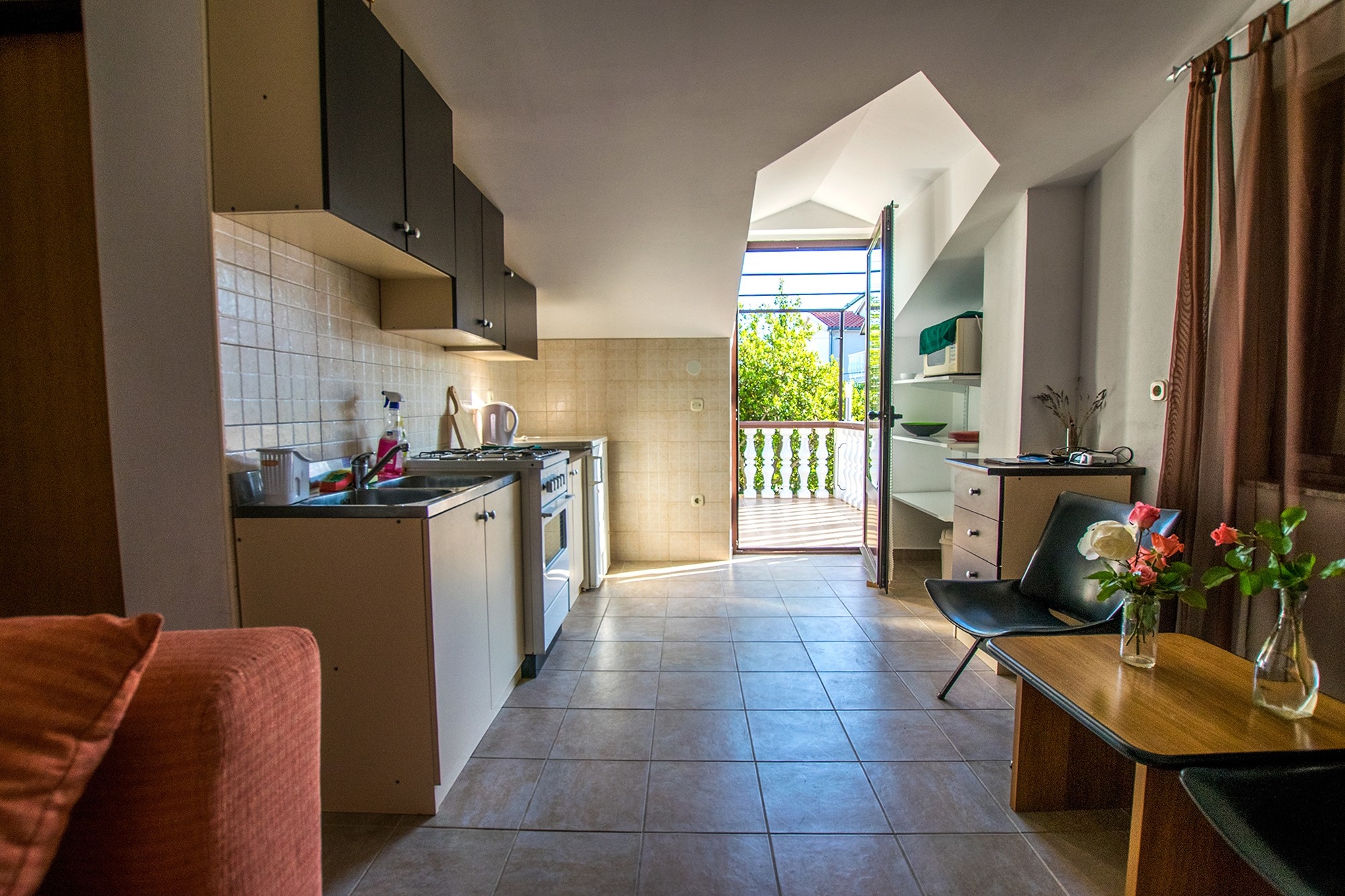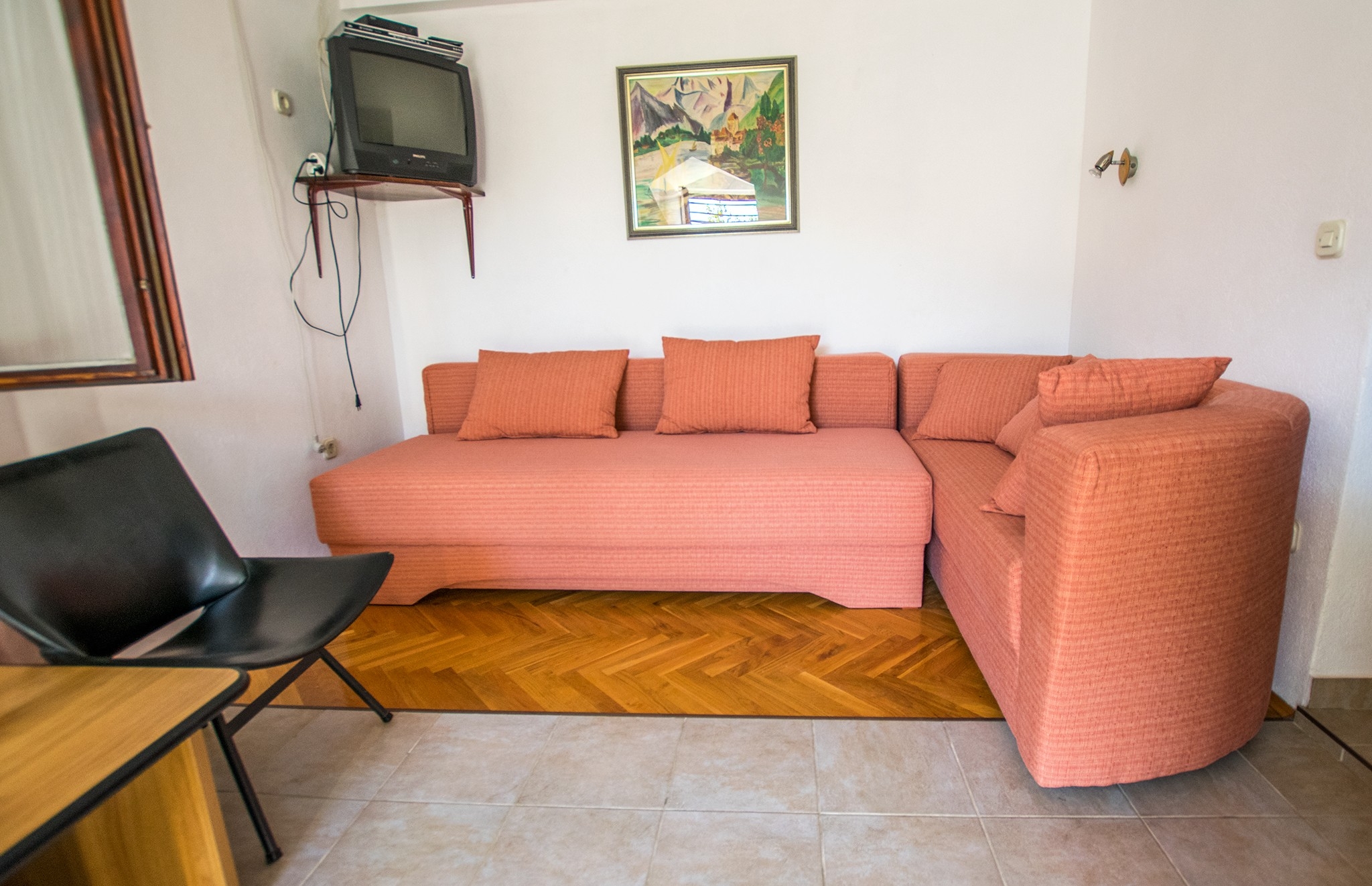 Apartament może przyjąć 4 gości. Łóżka znajdują się w sypialniach, których jest 1, oraz w pokoju dziennym, na powierzchni 28m2. Goście mają dostęp do tarasu, by korzystać z ciepłych, letnich wieczorów. Z apartamentu roztacza się widok na morze. Możliwość przygotowywania posiłków poprzez korzystanie ze wspólnego grilla. WLICZONE W CENĘ: taksa pobytowa, sprzątanie końcowe, klimatyzacja, parking, internet. Dostępność dodatkowych usług w rezerwowanym terminie oraz ich cenę (jeśli nie jest podana) należy sprawdzić wcześniej. Za dodatowe usługi, które nie zostały uwzględnione w kalkulacji ceny, płaci się bezpośrednio właścicielowi obiektu, pod warunkiem śe gość korzysta z tych usług.