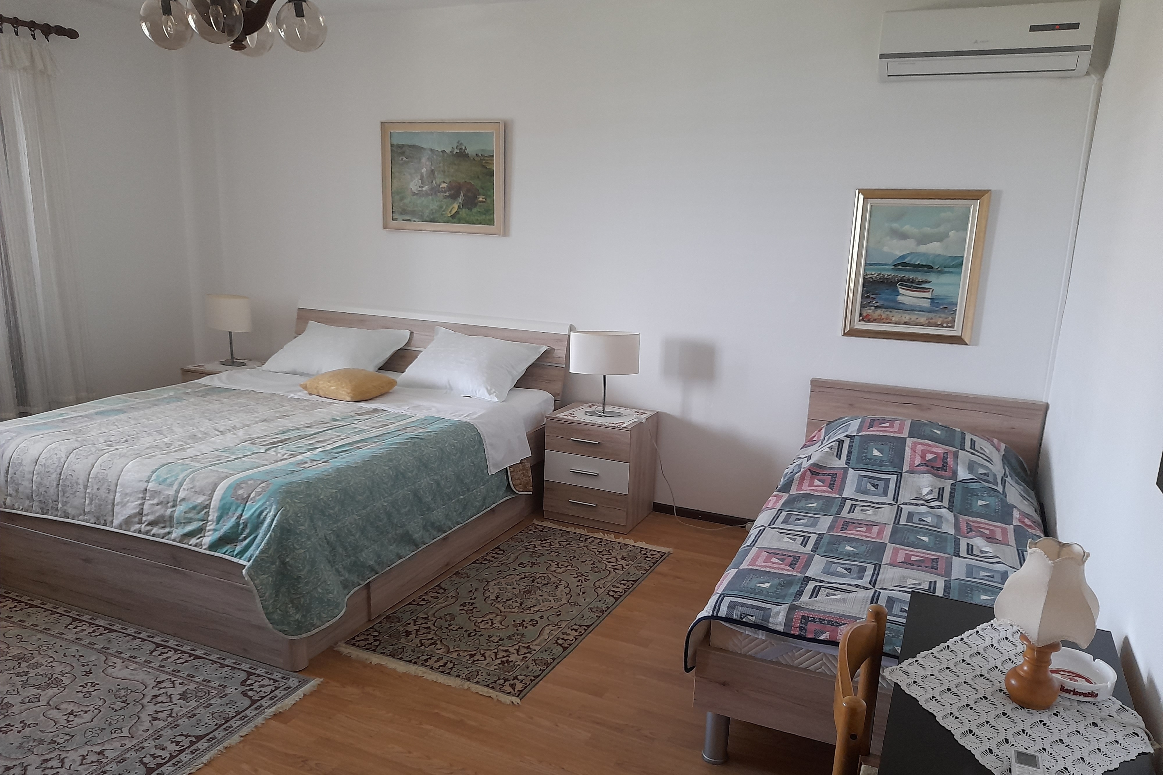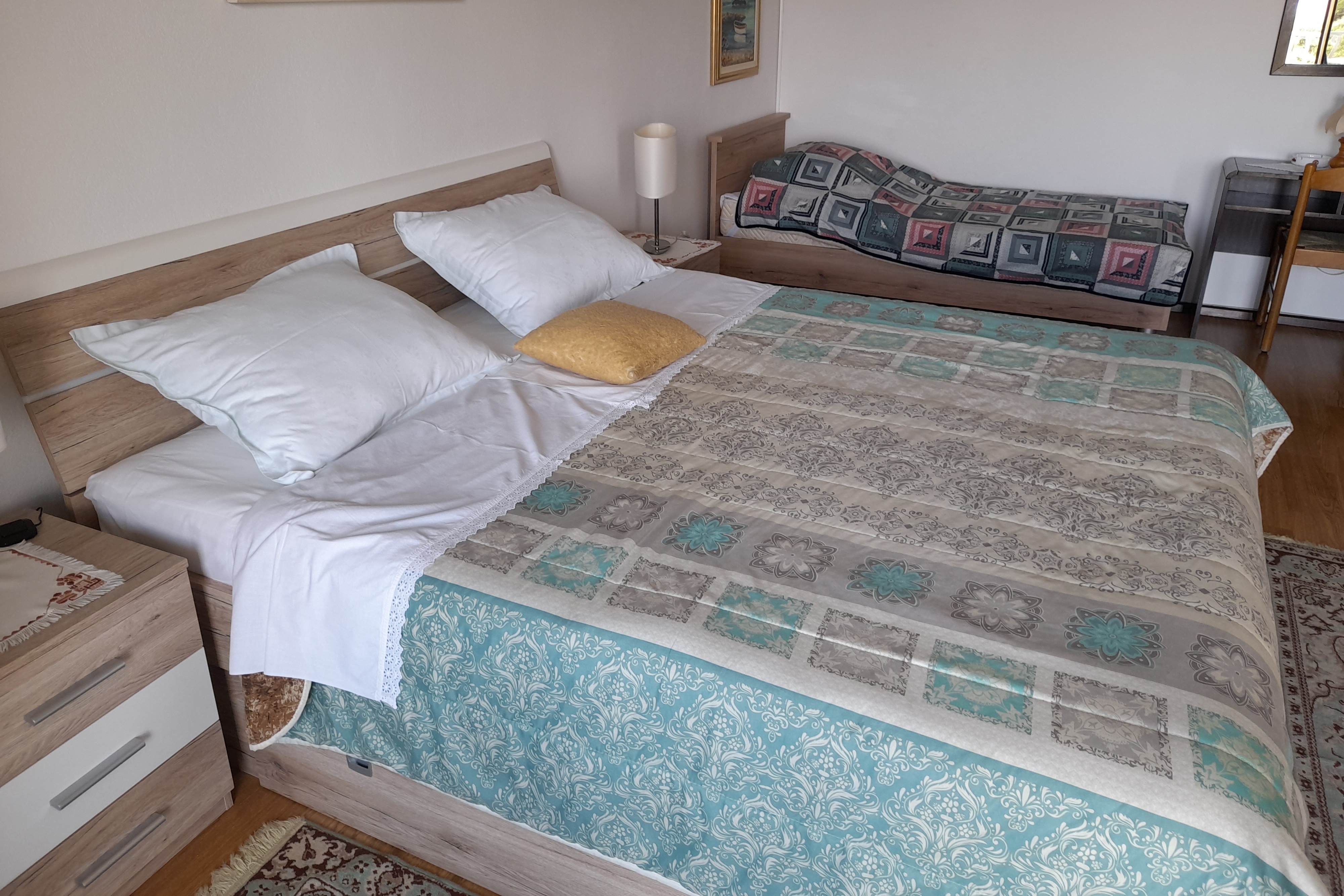 Apartament może przyjąć 5 gości. Łóżka znajdują się w sypialniach, których jest 2, na powierzchni 69m2. Goście mają dostęp do balkonu, by korzystać z ciepłych, letnich wieczorów. Z apartamentu roztacza się widok na morze. Możliwość przygotowywania posiłków poprzez korzystanie ze wspólnego grilla. WLICZONE W CENĘ: taksa pobytowa, sprzątanie końcowe, klimatyzacja, parking, internet. NIEOBOWIĄZKOWE KOSZTY DODATKOWE: dostawka (5,00 € za nocleg). Dostępność dodatkowych usług w rezerwowanym terminie oraz ich cenę (jeśli nie jest podana) należy sprawdzić wcześniej. Za dodatowe usługi, które nie zostały uwzględnione w kalkulacji ceny, płaci się bezpośrednio właścicielowi obiektu, pod warunkiem śe gość korzysta z tych usług.