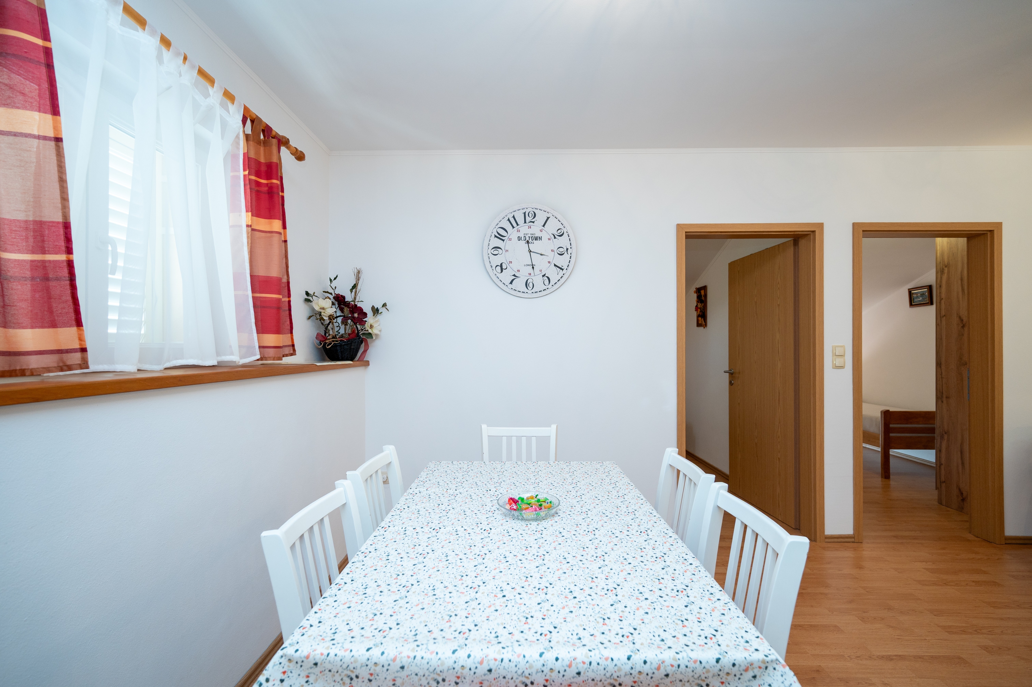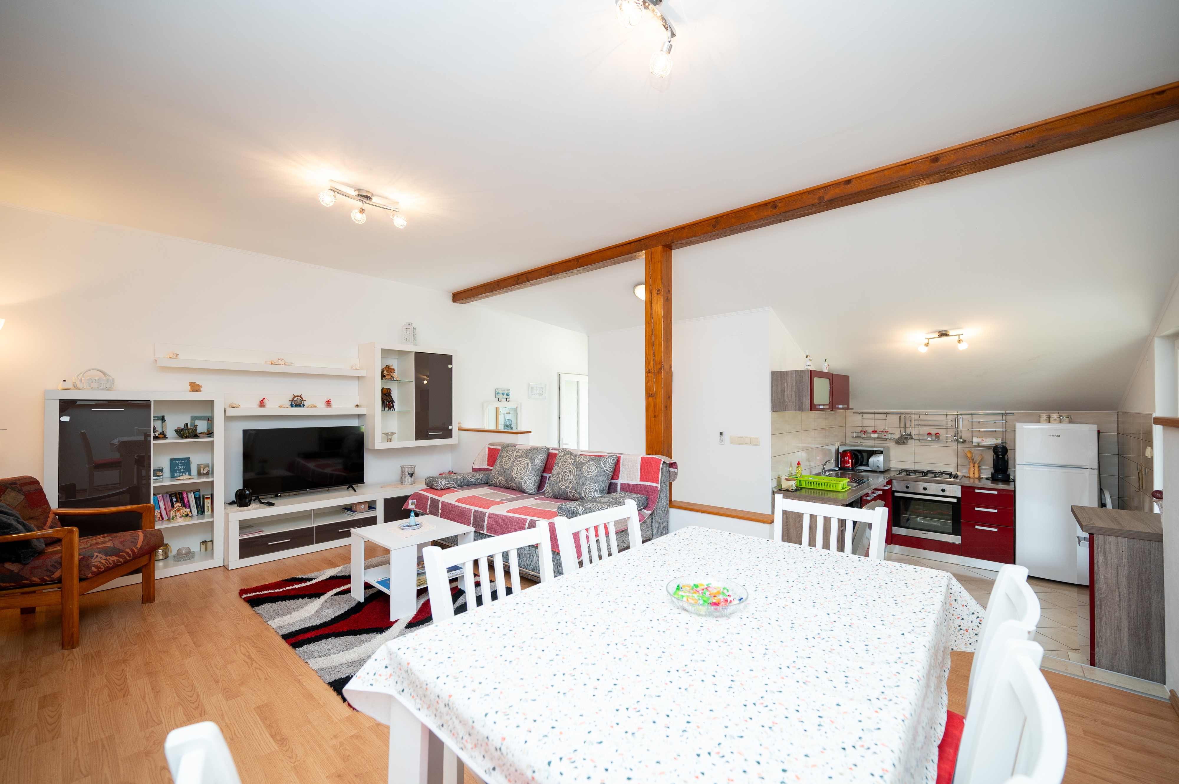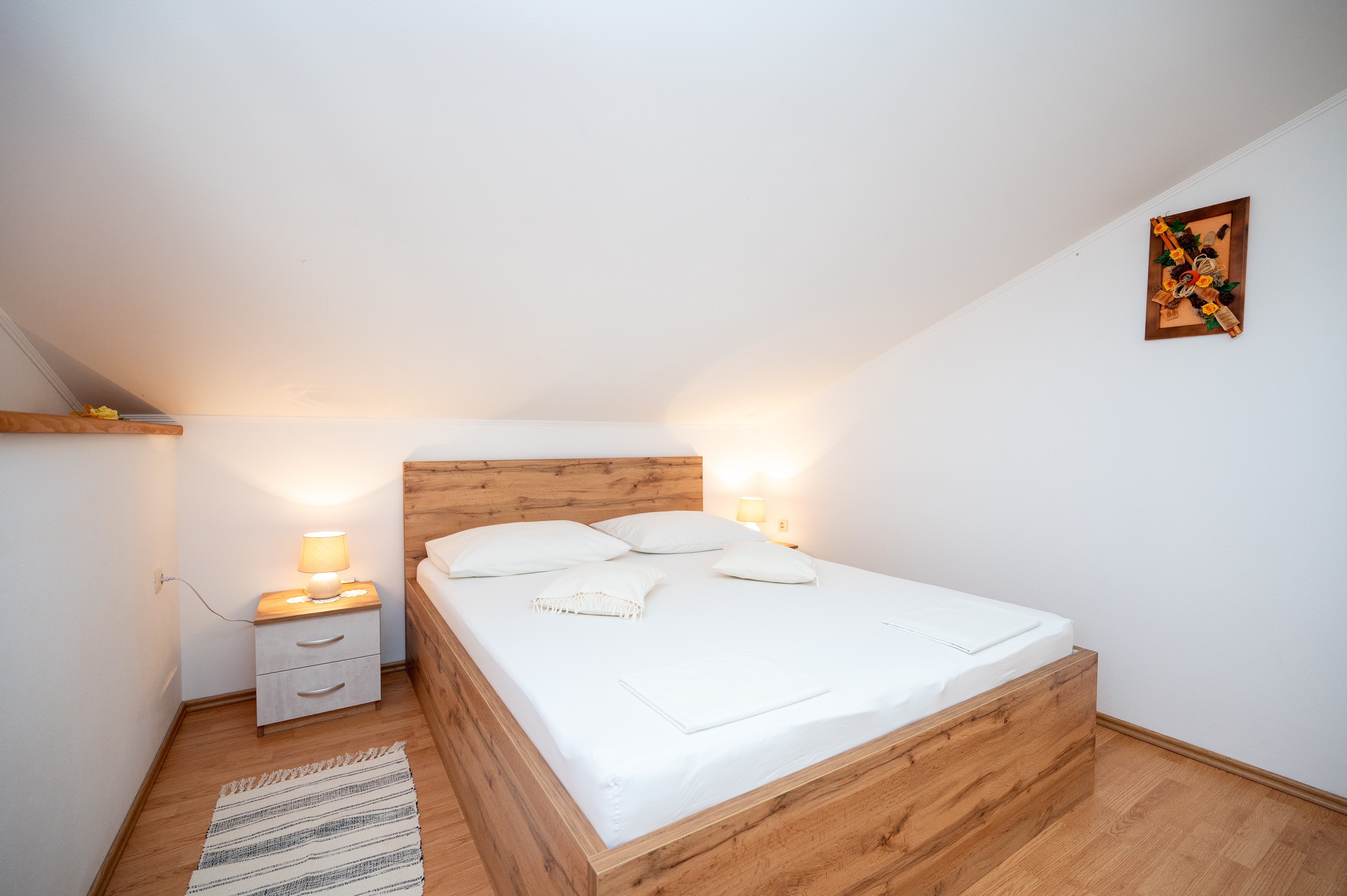 Apartament może przyjąć 4 gości. Łóżka znajdują się w sypialniach, których jest 2, na powierzchni 48m2. Goście mają dostęp do tarasu, by korzystać z ciepłych, letnich wieczorów. Z apartamentu roztacza się widok na morze. Możliwość przygotowywania posiłków poprzez korzystanie ze wspólnego grilla. W kwaterze dozwolony jest pobyt zwierzęcia domowego, za dopłatą. WLICZONE W CENĘ: taksa pobytowa, sprzątanie końcowe, klimatyzacja, parking, internet, łóżeczko dziecięce, żelazko, deska do prasowania, suszarka do włosów. OBOWIĄZKOWE KOSZTY DODATKOWE: dopłata za krótki termin (procent dopłaty w zalezności od liczby noclegów: 30% - 1, 20% - 2, 10% - 3). NIEOBOWIĄZKOWE KOSZTY DODATKOWE: zwierzęta domowe (10,00 € za nocleg). Dostępność dodatkowych usług w rezerwowanym terminie oraz ich cenę (jeśli nie jest podana) należy sprawdzić wcześniej. Za dodatowe usługi, które nie zostały uwzględnione w kalkulacji ceny, płaci się bezpośrednio właścicielowi obiektu, pod warunkiem śe gość korzysta z tych usług.