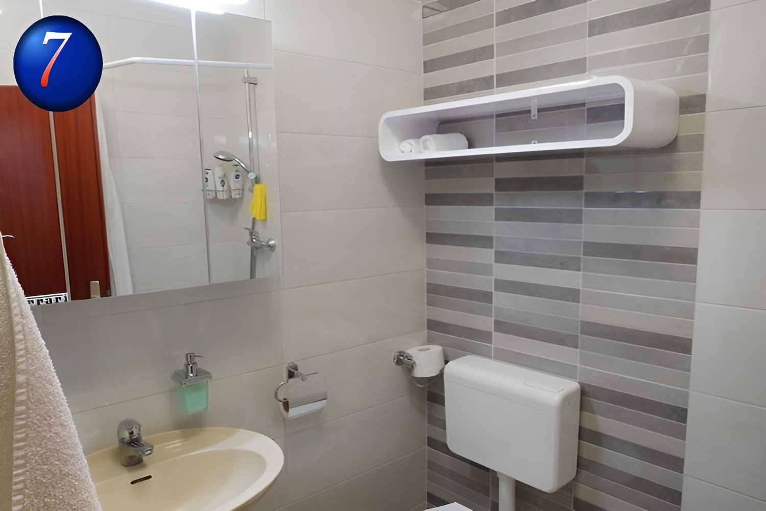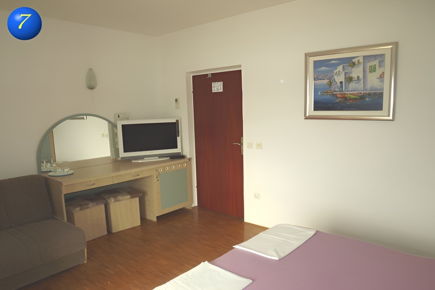 Pokój może przyjąć 2 gości. Łóżka znajdują się w sypialniach, których jest 1, na powierzchni 16m2. Goście mają dostęp do balkonu, by korzystać z ciepłych, letnich wieczorów. Z pokoju roztacza się widok na morze. Rezerwowana kwatera to pokój z własną łazienką, bez możliwości korzystania z kuchni. WLICZONE W CENĘ: taksa pobytowa, śniadanie, sprzątanie końcowe, klimatyzacja, parking, internet, miejsce do cumowania łodzi, suszarka do włosów. NIEOBOWIĄZKOWE KOSZTY DODATKOWE: pranie bielizny (5,00 € pranie), dostawka (18,90 € za nocleg). Dostępność dodatkowych usług w rezerwowanym terminie oraz ich cenę (jeśli nie jest podana) należy sprawdzić wcześniej. Za dodatowe usługi, które nie zostały uwzględnione w kalkulacji ceny, płaci się bezpośrednio właścicielowi obiektu, pod warunkiem śe gość korzysta z tych usług.