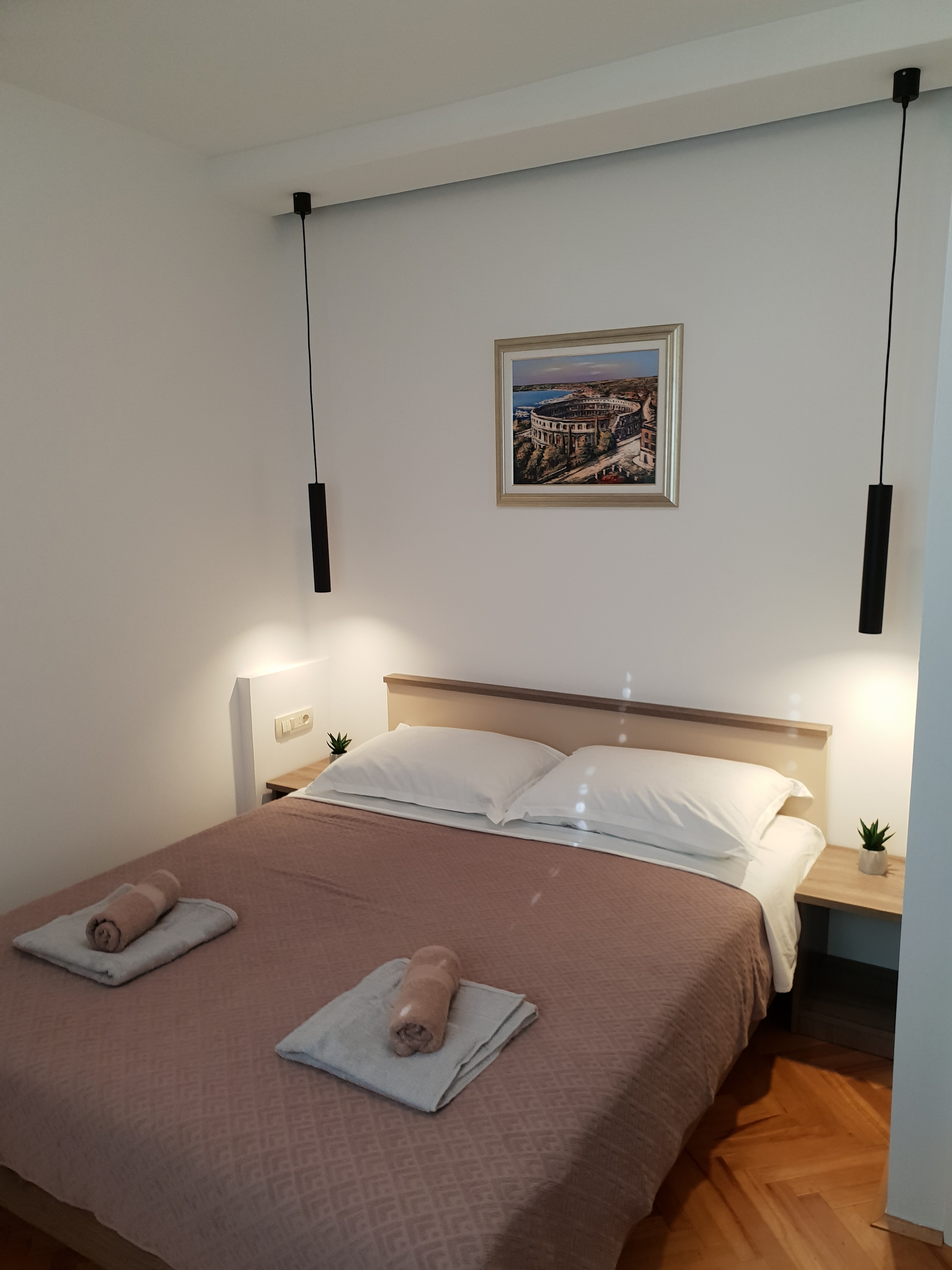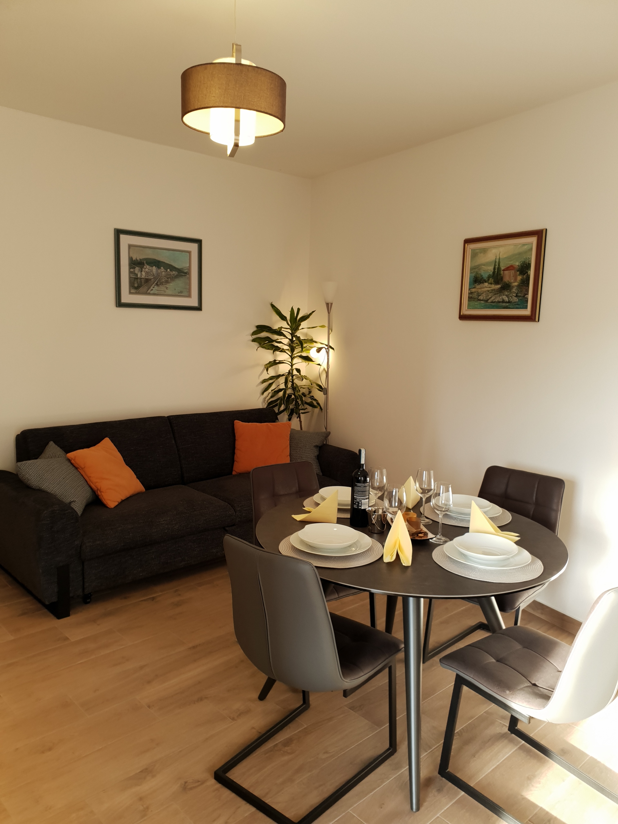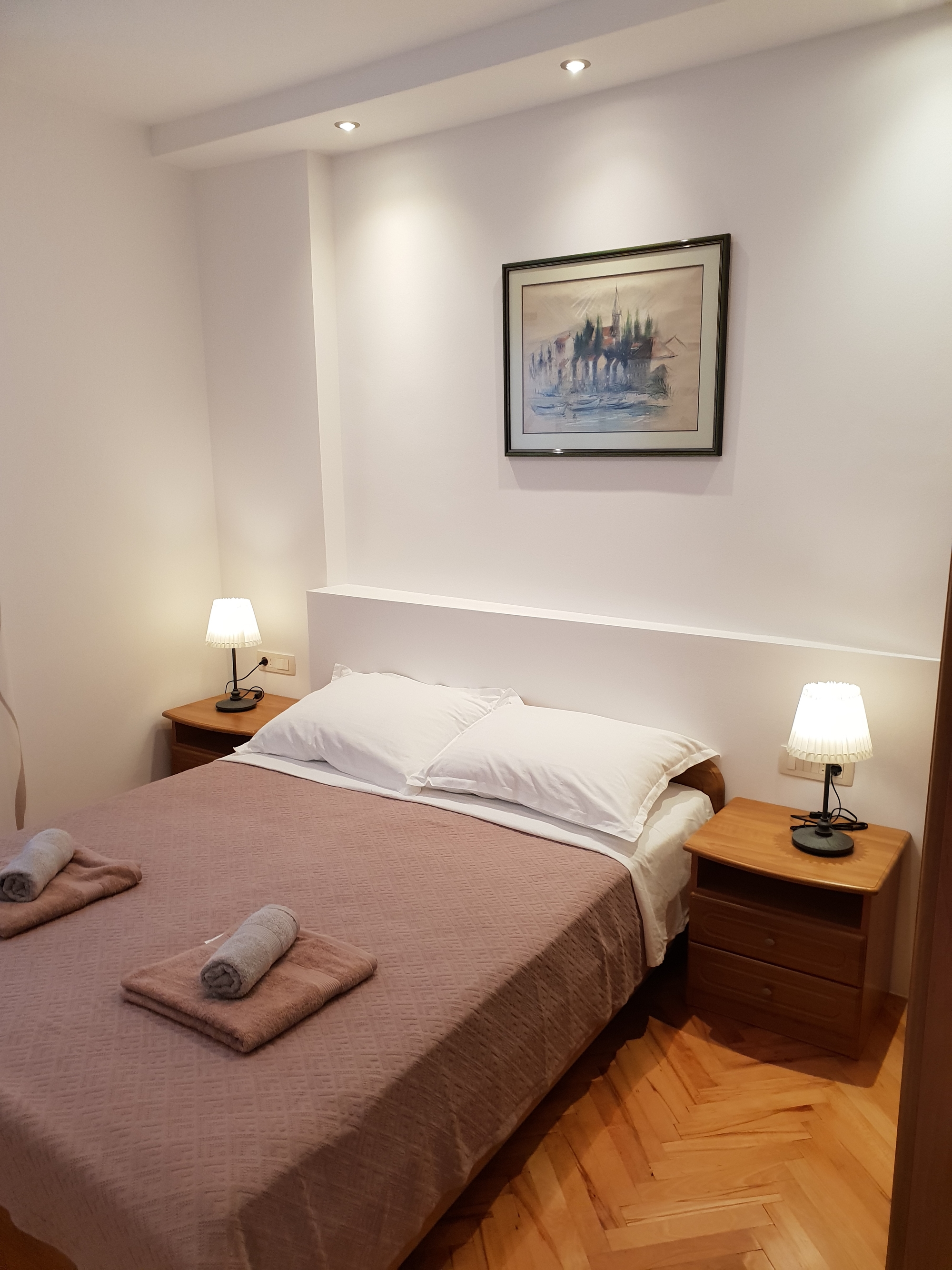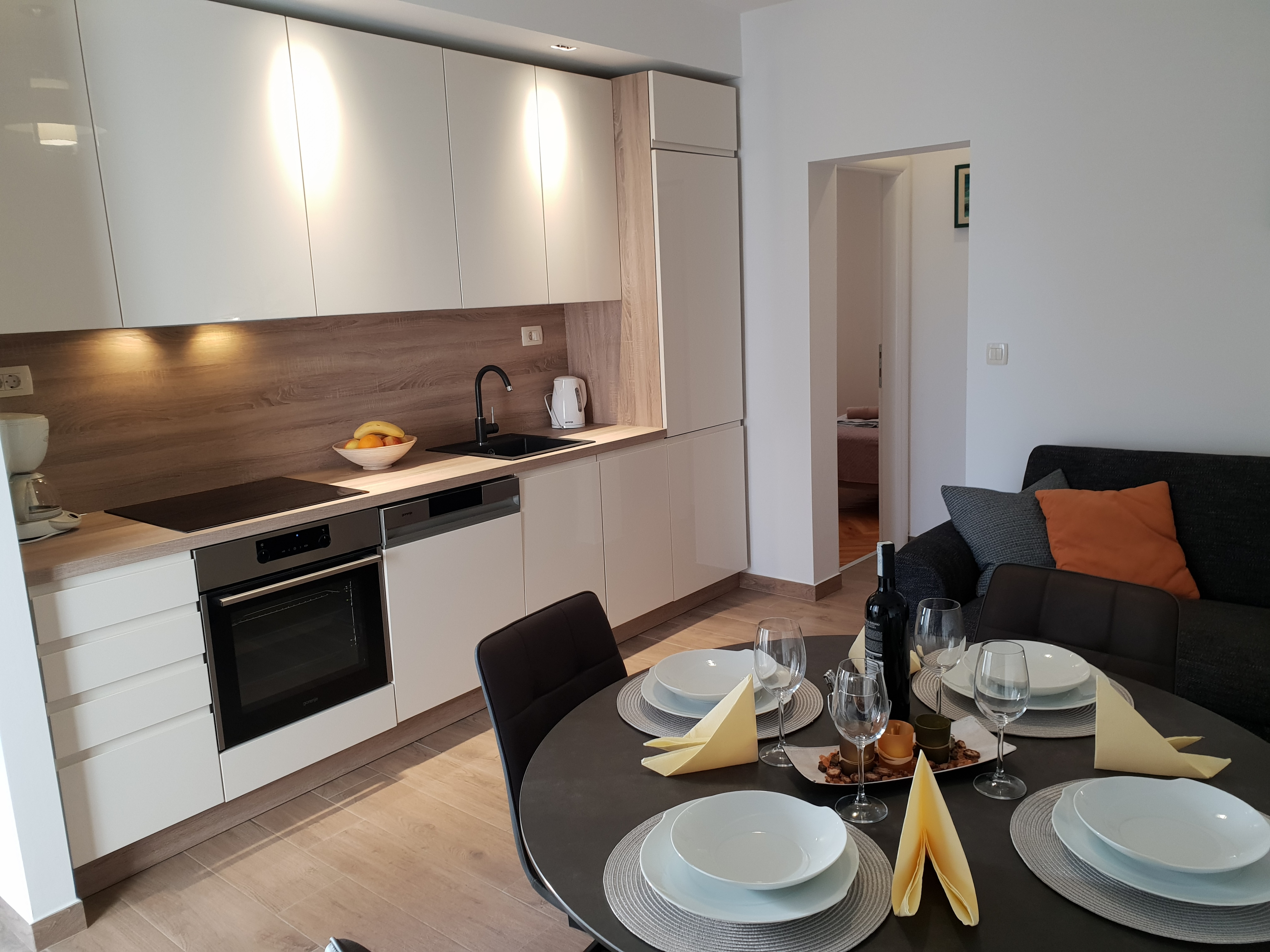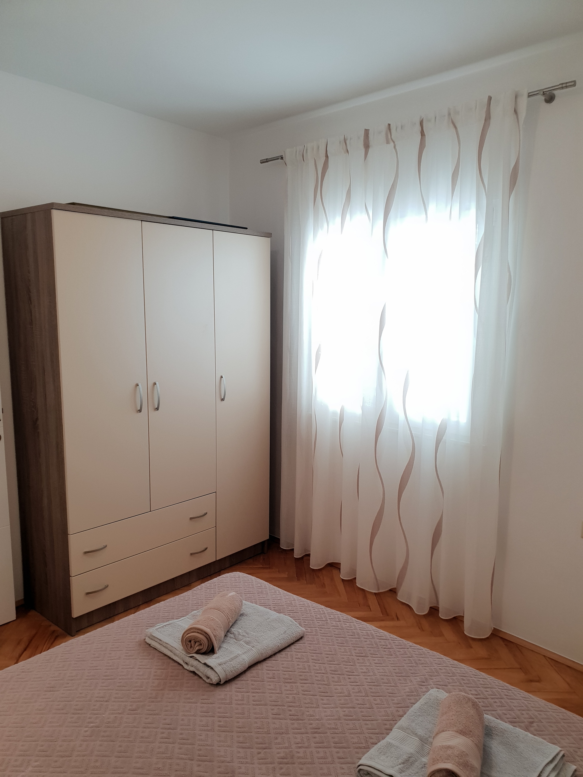 Apartament może przyjąć 4 gości. Łóżka znajdują się w sypialniach, których jest 2, na powierzchni 44m2. Goście mają dostęp do tarasu, by korzystać z ciepłych, letnich wieczorów. Z apartamentu roztacza się widok na morze. Możliwość przygotowywania posiłków poprzez korzystanie ze wspólnego grilla. WLICZONE W CENĘ: taksa pobytowa, sprzątanie końcowe, klimatyzacja, parking, internet, łóżeczko dziecięce, żelazko, deska do prasowania, suszarka do włosów. NIEOBOWIĄZKOWE KOSZTY DODATKOWE: pranie bielizny (10,00 € pranie), łódź (50,00 € za nocleg), miejsce do cumowania łodzi (10,00 € za nocleg), rower (5,00 € za dzień (za sztukę)). Dostępność dodatkowych usług w rezerwowanym terminie oraz ich cenę (jeśli nie jest podana) należy sprawdzić wcześniej. Za dodatowe usługi, które nie zostały uwzględnione w kalkulacji ceny, płaci się bezpośrednio właścicielowi obiektu, pod warunkiem śe gość korzysta z tych usług.