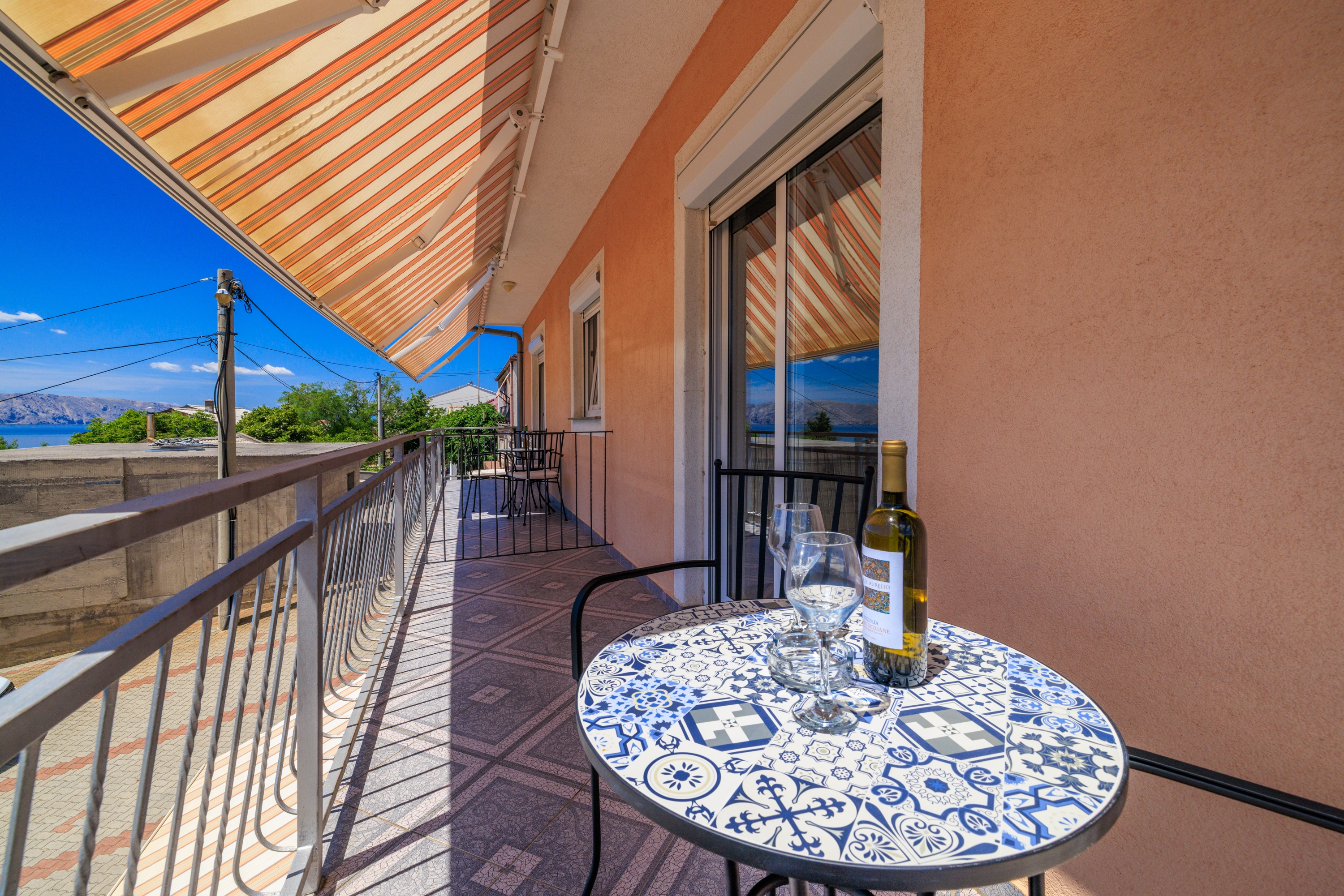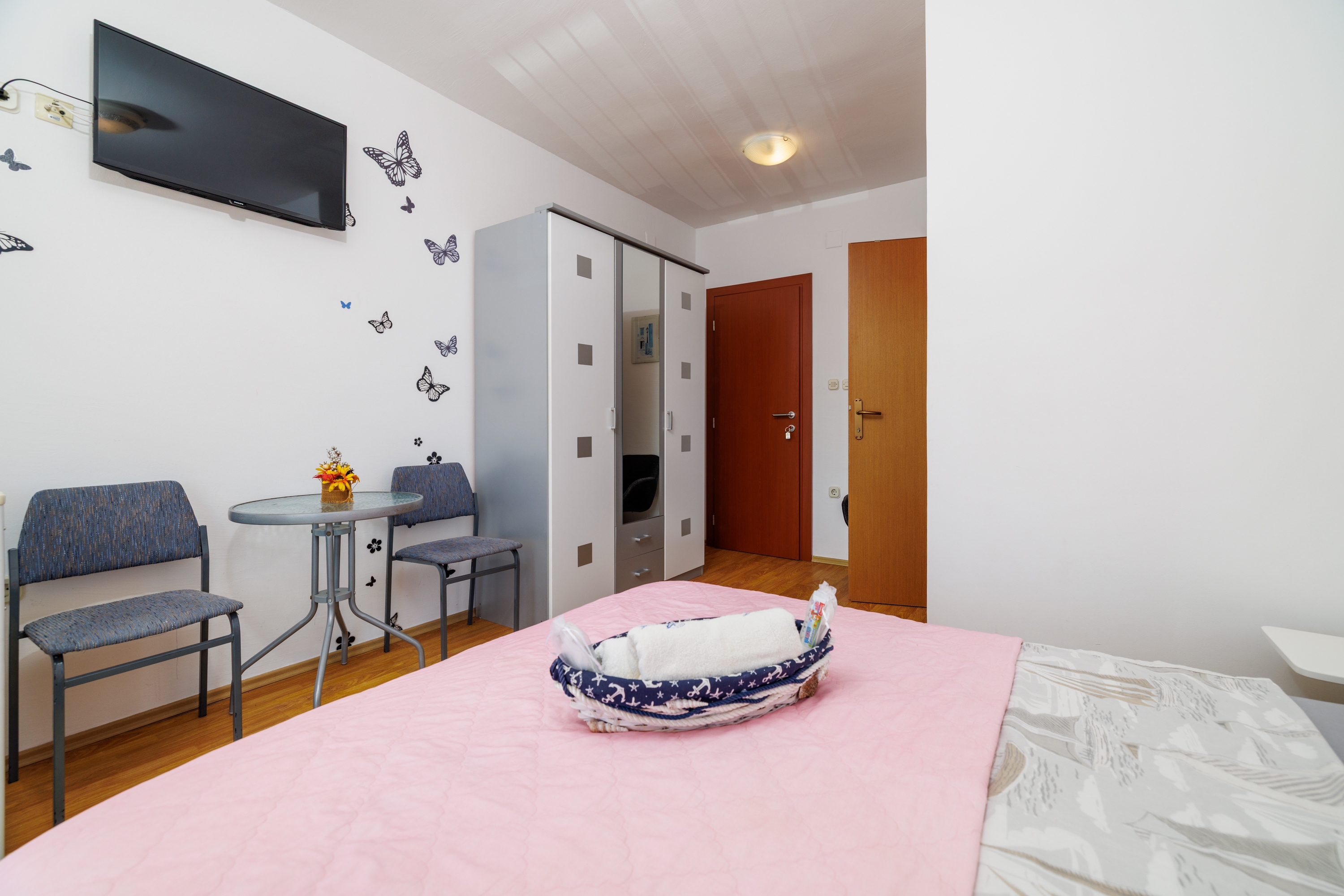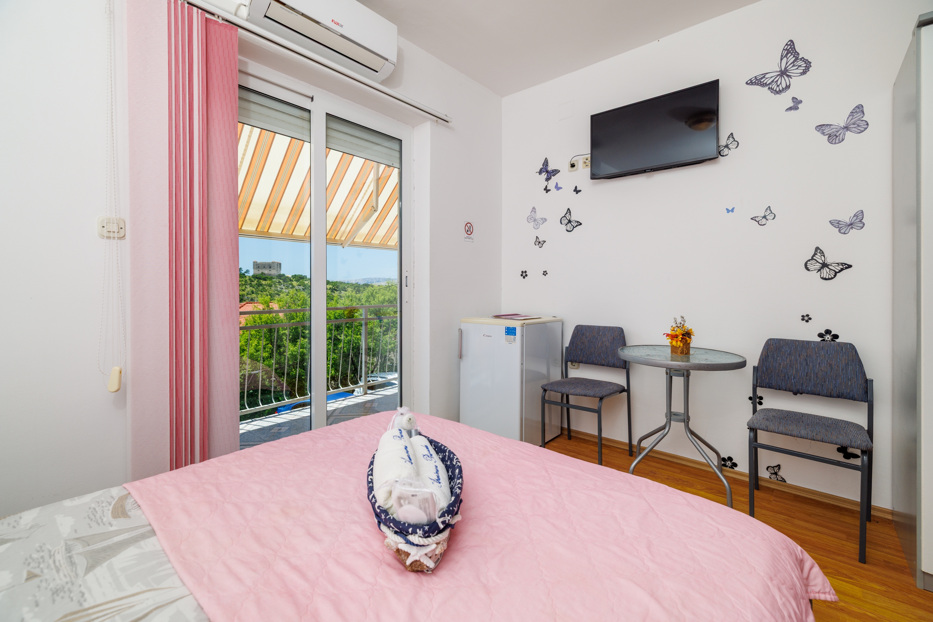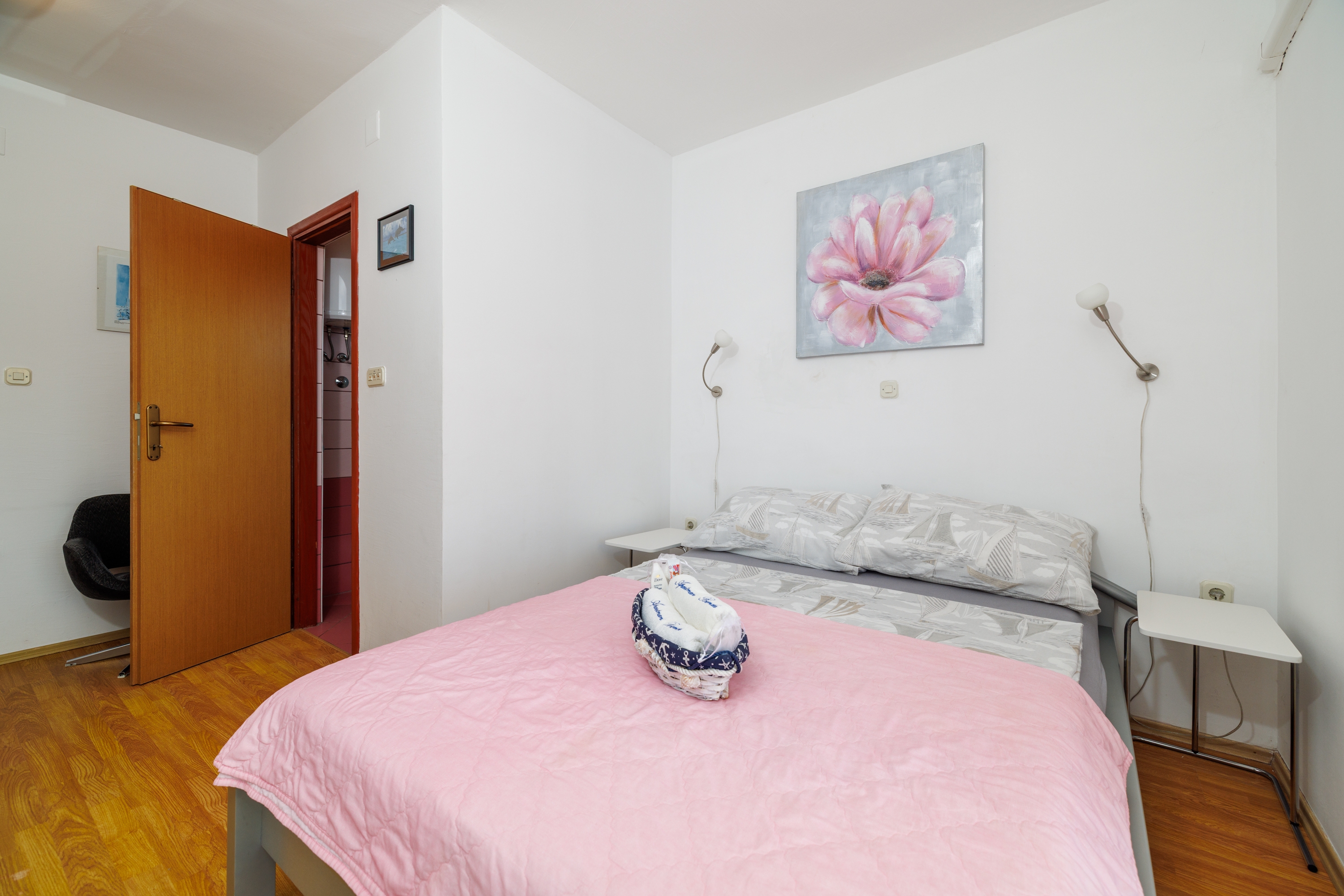 Pokój może przyjąć 2 gości. Łóżka znajdują się w sypialniach, których jest 1, na powierzchni 15m2. Goście mają dostęp do balkonu, by korzystać z ciepłych, letnich wieczorów. Z pokoju roztacza się widok na morze. Możliwość przygotowywania posiłków poprzez korzystanie ze wspólnego grilla. Rezerwowana kwatera to pokój z własną łazienką, bez możliwości korzystania z kuchni. WLICZONE W CENĘ: taksa pobytowa, sprzątanie końcowe, parking, internet, żelazko. NIEOBOWIĄZKOWE KOSZTY DODATKOWE: klimatyzacja (5,00 € za nocleg), pranie bielizny (5,00 € pranie), dostawka (7,00 € za nocleg). Dostępność dodatkowych usług w rezerwowanym terminie oraz ich cenę (jeśli nie jest podana) należy sprawdzić wcześniej. Za dodatowe usługi, które nie zostały uwzględnione w kalkulacji ceny, płaci się bezpośrednio właścicielowi obiektu, pod warunkiem śe gość korzysta z tych usług. Zniżki od ceny podstawowej: bezpłatny dzień 14=13 (przy pobycie, trwającym co najmniej 14 dni, otrzymujecie jeden bezpłatny dzień na pobyt do 31.12.2026).