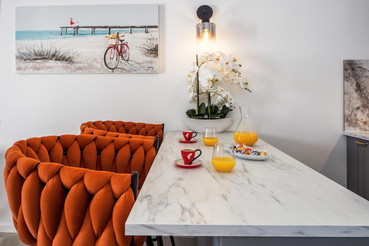 Apartament z 2 sypialniami, tarasem i widokiem na morze. This spacious apartment comprises 1 living room, 2 separate bedrooms and 1 bathroom with a shower and free toiletries. Meals can be prepared in the well-fitted kitchen, which comes with a stovetop, a refrigerator, a dishwasher and kitchenware. The air-conditioned apartment provides a flat-screen TV with streaming services, a washing machine, a private entrance, a tea and coffee maker as well as sea views. The unit offers 3 beds. Apartament - 5 osobowy. Powierzchnia pokoju ok.: 65 mkw.