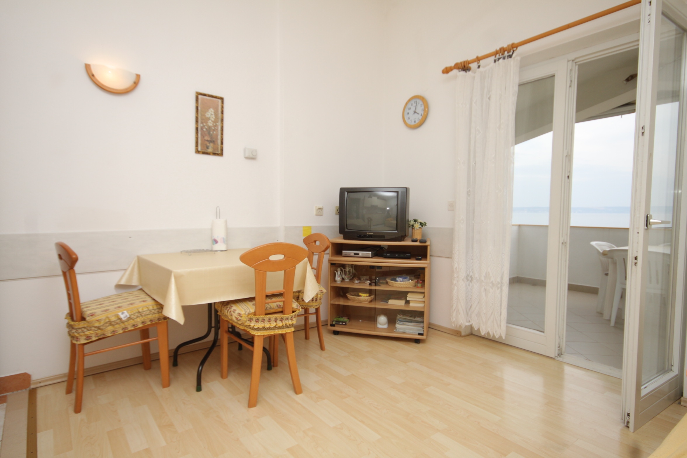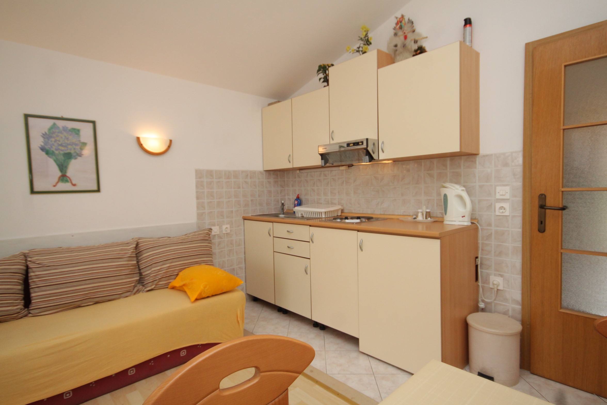 Apartament może przyjąć 3 gości. Łóżka znajdują się w sypialniach, których jest 1, oraz w pokoju dziennym, na powierzchni 30m2. Goście mają dostęp do tarasu, by korzystać z ciepłych, letnich wieczorów. Z apartamentu roztacza się widok na morze. Możliwość przygotowywania posiłków poprzez korzystanie ze wspólnego grilla. WLICZONE W CENĘ: taksa pobytowa, sprzątanie końcowe, klimatyzacja, centralne ogrzewanie, parking, internet, pranie bielizny, miejsce do cumowania łodzi, łóżeczko dziecięce, żelazko, deska do prasowania, suszarka do włosów, parasol. OBOWIĄZKOWE KOSZTY DODATKOWE: dopłata za krótki termin (procent dopłaty w zalezności od liczby noclegów: 30% - 1, 20% - 2, 10% - 3). NIEOBOWIĄZKOWE KOSZTY DODATKOWE: dostawka (10,00 € za nocleg). Dostępność dodatkowych usług w rezerwowanym terminie oraz ich cenę (jeśli nie jest podana) należy sprawdzić wcześniej. Za dodatowe usługi, które nie zostały uwzględnione w kalkulacji ceny, płaci się bezpośrednio właścicielowi obiektu, pod warunkiem śe gość korzysta z tych usług.