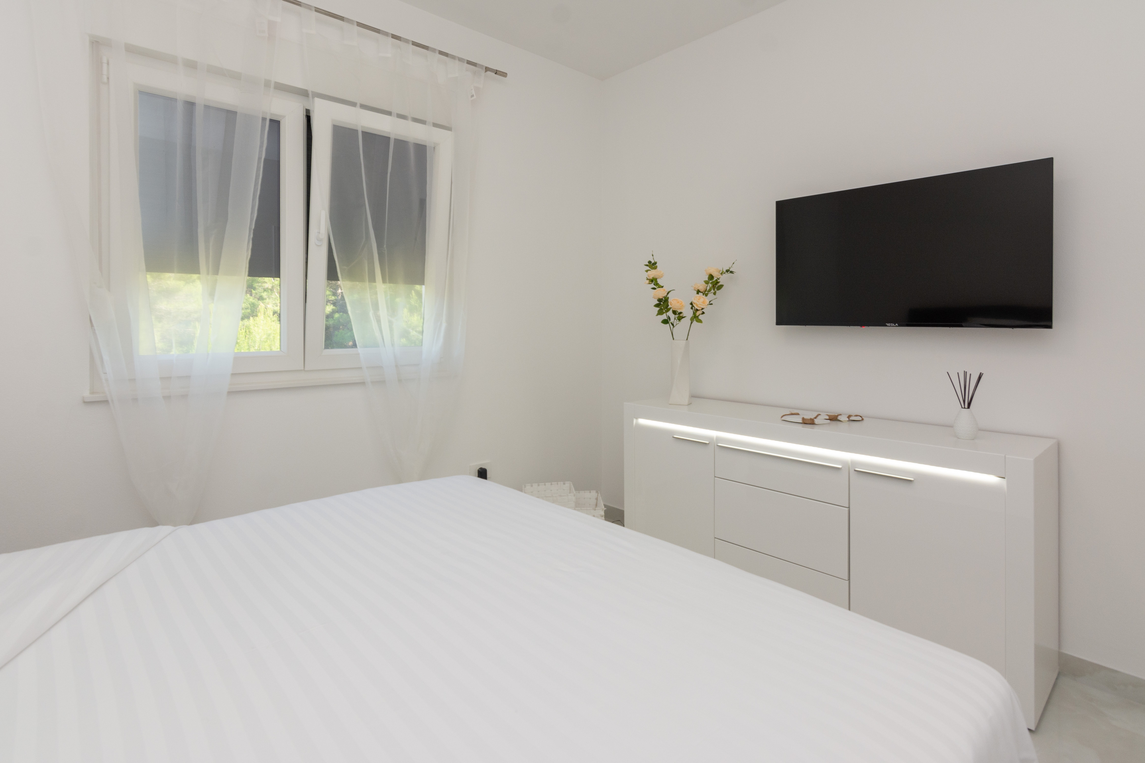 Apartament może przyjąć 5 gości. Łóżka znajdują się w sypialniach, których jest 2, oraz w pokoju dziennym, na powierzchni 68m2. Goście mają dostęp do tarasu, by korzystać z ciepłych, letnich wieczorów. Z apartamentu roztacza się widok na morze. Możliwość przygotowywania posiłków poprzez korzystanie ze wspólnego grilla. WLICZONE W CENĘ: taksa pobytowa, sprzątanie końcowe, klimatyzacja, parking, internet, łóżeczko dziecięce, żelazko, deska do prasowania, suszarka do włosów. OBOWIĄZKOWE KOSZTY DODATKOWE: dopłata za krótki termin (procent dopłaty w zalezności od liczby noclegów: 30% - 1, 20% - 2, 10% - 3). Dostępność dodatkowych usług w rezerwowanym terminie oraz ich cenę (jeśli nie jest podana) należy sprawdzić wcześniej. Za dodatowe usługi, które nie zostały uwzględnione w kalkulacji ceny, płaci się bezpośrednio właścicielowi obiektu, pod warunkiem śe gość korzysta z tych usług.