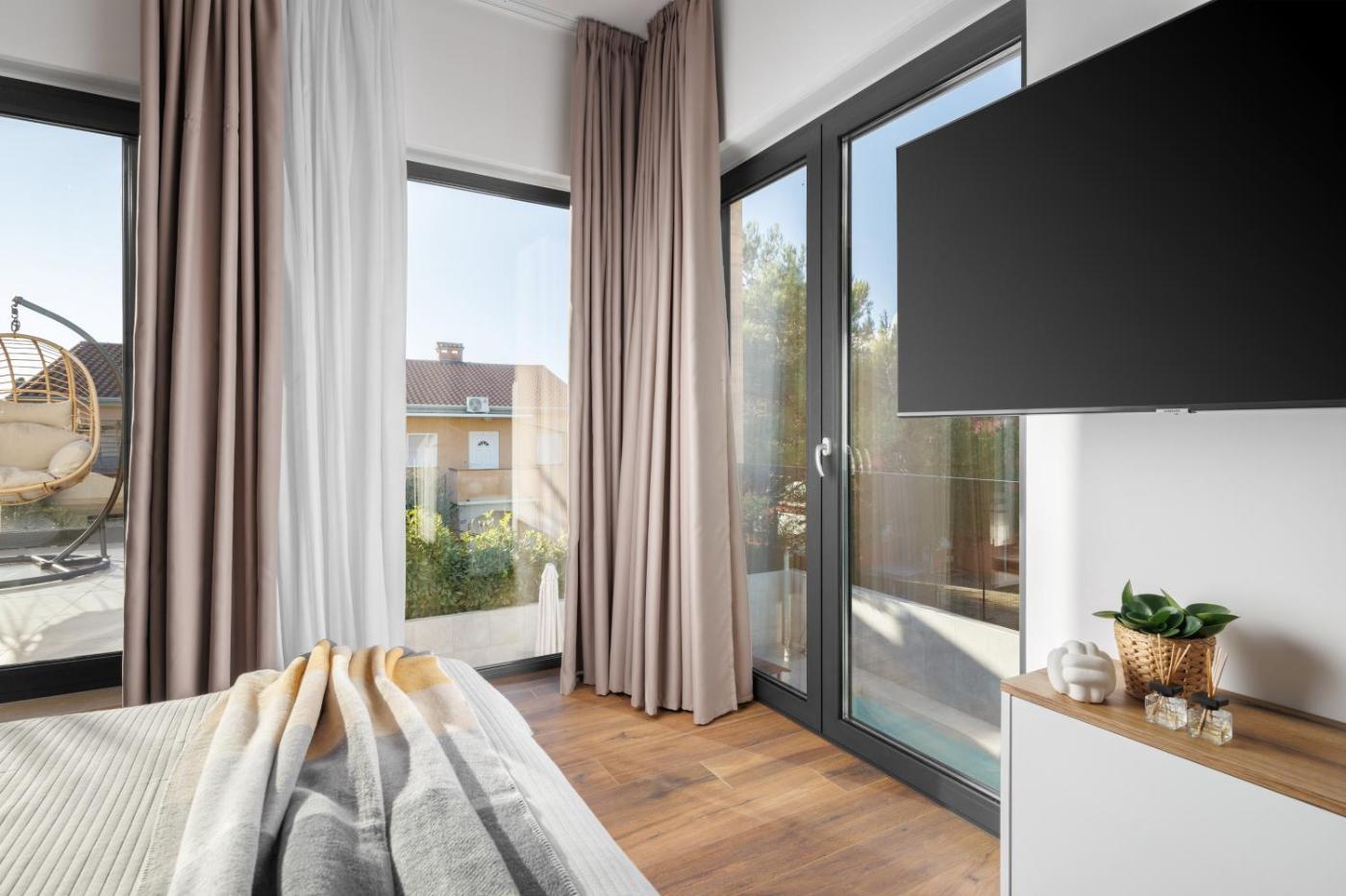 Willa z prywatnym basenem. This villas standout features are the infinity pool, hot tub and sauna. Boasting a private entrance, this air-conditioned villa includes 1 living room, 4 separate bedrooms and 5 bathrooms with a walk-in shower and a hairdryer. Guests will find a stovetop, a refrigerator, a dishwasher and kitchenware in the kitchen. The villa also features a barbecue. The spacious villa offers a flat-screen TV with streaming services, a washing machine, soundproof walls, a tea and coffee maker as well as garden views. The unit has 5 beds. Willa - 9 osobowy. Powierzchnia pokoju ok.: 300 mkw.